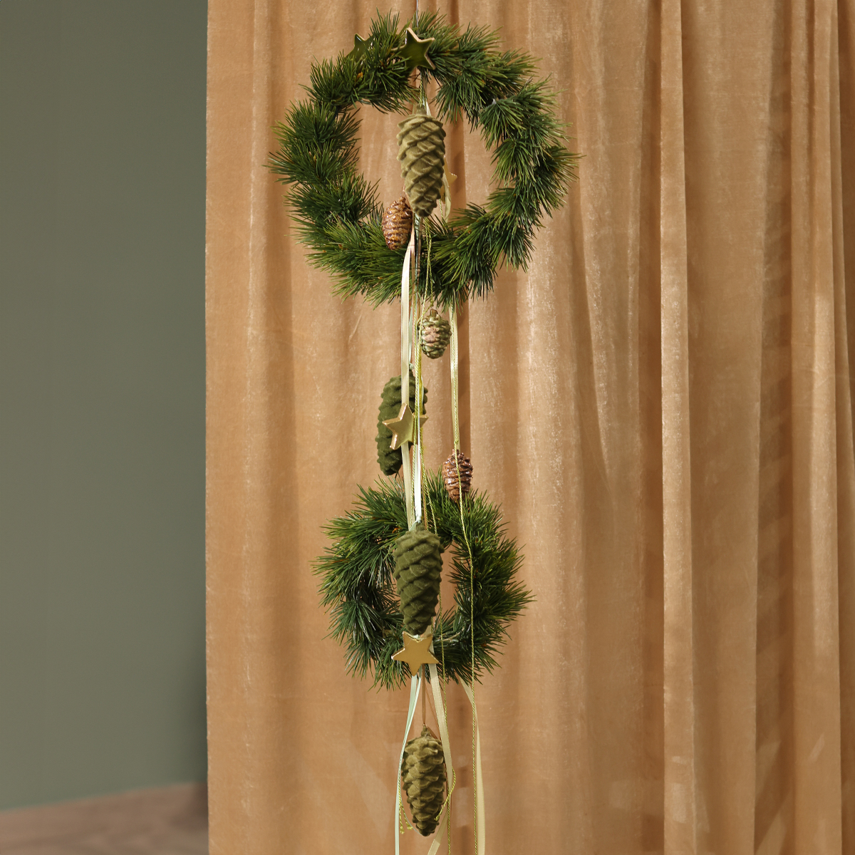 - Kuusi männynkäpyriipusta, satunnaisesti sekoitettuna tummanvihreänä ja kuusenvihreänä, kooltaan noin 11,5 cm