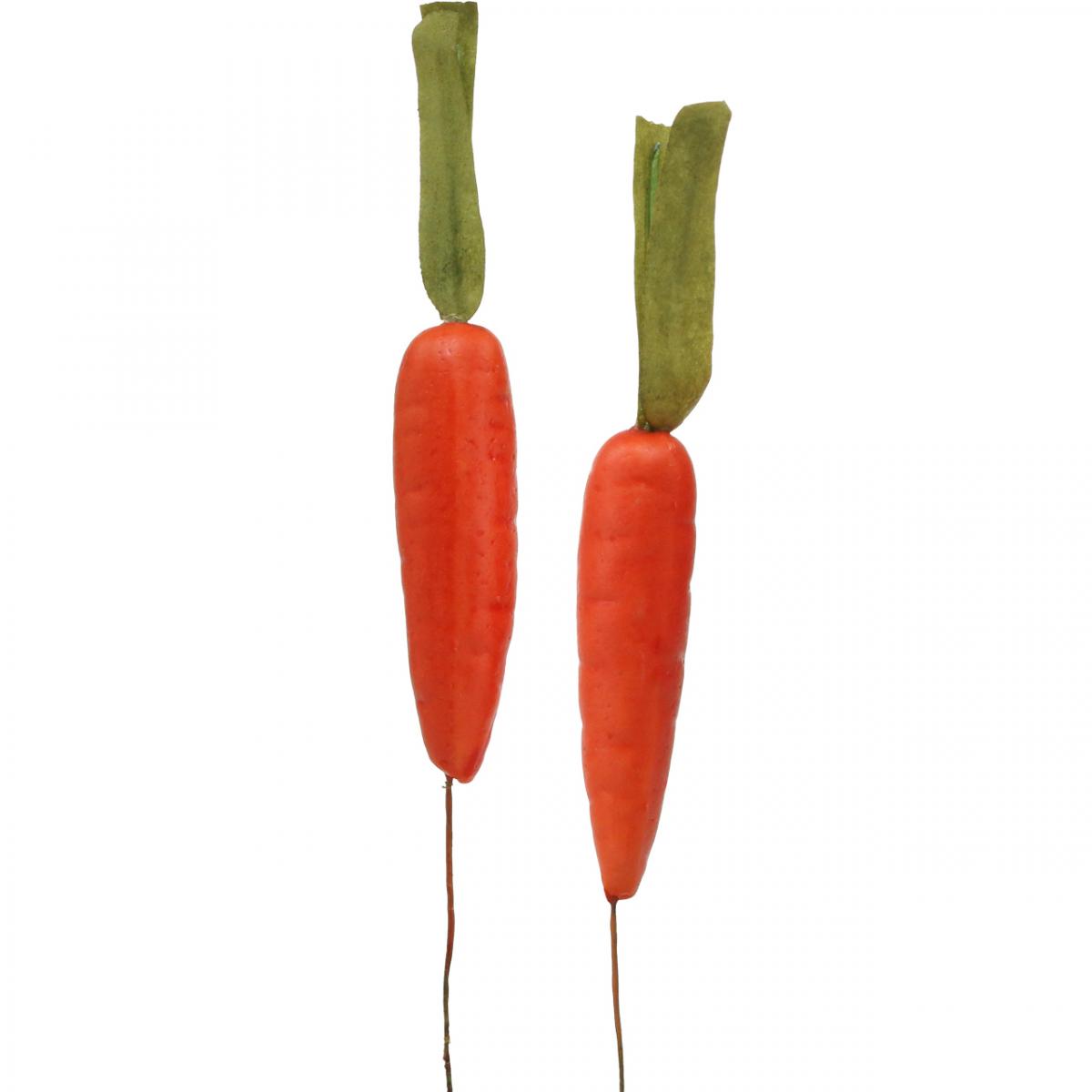 Pääsiäiskoristeista ei pitäisi puuttua koristeporkkanoita! Näillä porkkanoilla langalla sinulla on keinotekoinen kasvis pienoiskoossa, joka näyttää hyvin samanlaiselta kuin todellinen!Koristeelliset porkkanat on suunniteltu rakkaudella polystyreenirungosta tyypillisen oranssin värisenä. Takapäästä ulkonee paperiporkkanakaali joustavalla metallilankavahvikkeella. Yläosassa pitkä oranssinruskea lanka muodostaa keinoporkkanan juuren, jolla koristevihannekset voidaan helposti pistää tai lankaa erilaisiin koriste-asetelmiin.