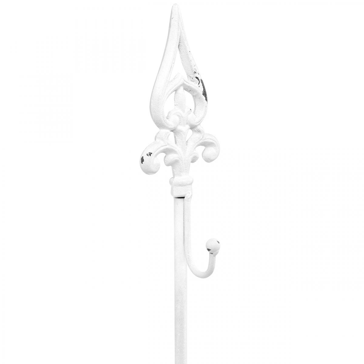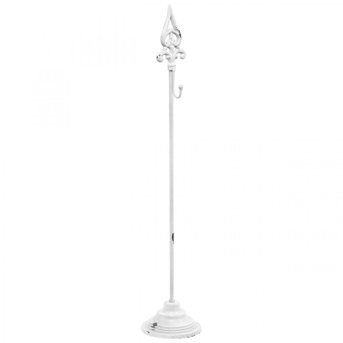 Valkoinen seppeleen pidike tuo shabby chiciä koristeellisiin seppeleisiin! Valurautaisessa metallikoristeessa on raskas pohja, joka estää jalustaa kaatumasta, sivussa on koukku seppeleen ripustamista varten ja tyylitellyn liljan muotoinen kärki. Metallinen jalusta maalattiin ensin ruskeaksi ja sitten valkoiseksi. Lopuksi seppeleen jalustan valkoinen maali oli paikoin kulunut pois, mikä antaa koristetelineelle tyypillisen vintage-ilmeen.