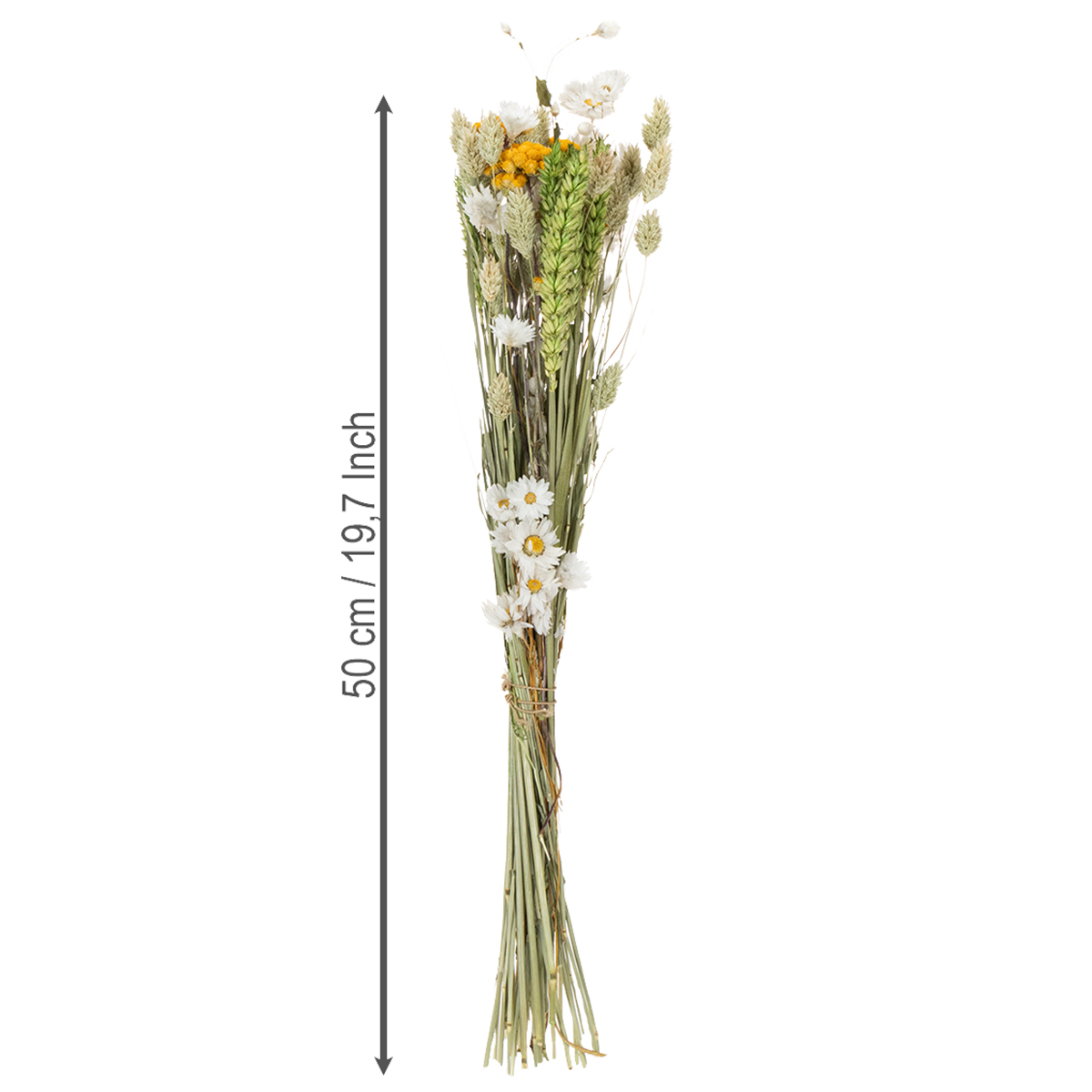 Tämä vaikuttava, 50 senttimetriä korkea kuivakukka-asetelma tarjoaa lukuisia suunnittelumahdollisuuksia. Olipa kyseessä tyylikäs pöytäkoristeena tai koriste-elementti kuivakukkamaljakossa, tämä asetelma vangitsee varmasti kaikkien huomion. Viljojen, olkinukkien, heinien ja muiden luonnonmateriaalien huolellisesti koordinoitu yhdistelmä luo harmonisen ilmeen. Se sopii erinomaisesti tuomaan ripauksen hillittyä eleganssia olohuoneeseen, eteiseen tai makuuhuoneeseen.