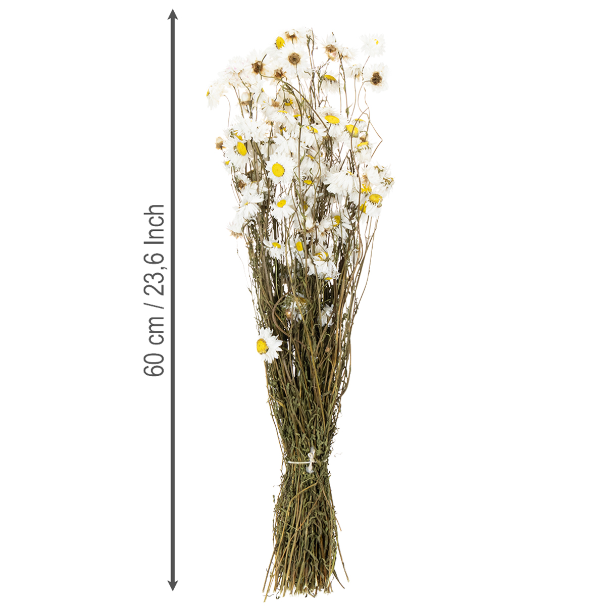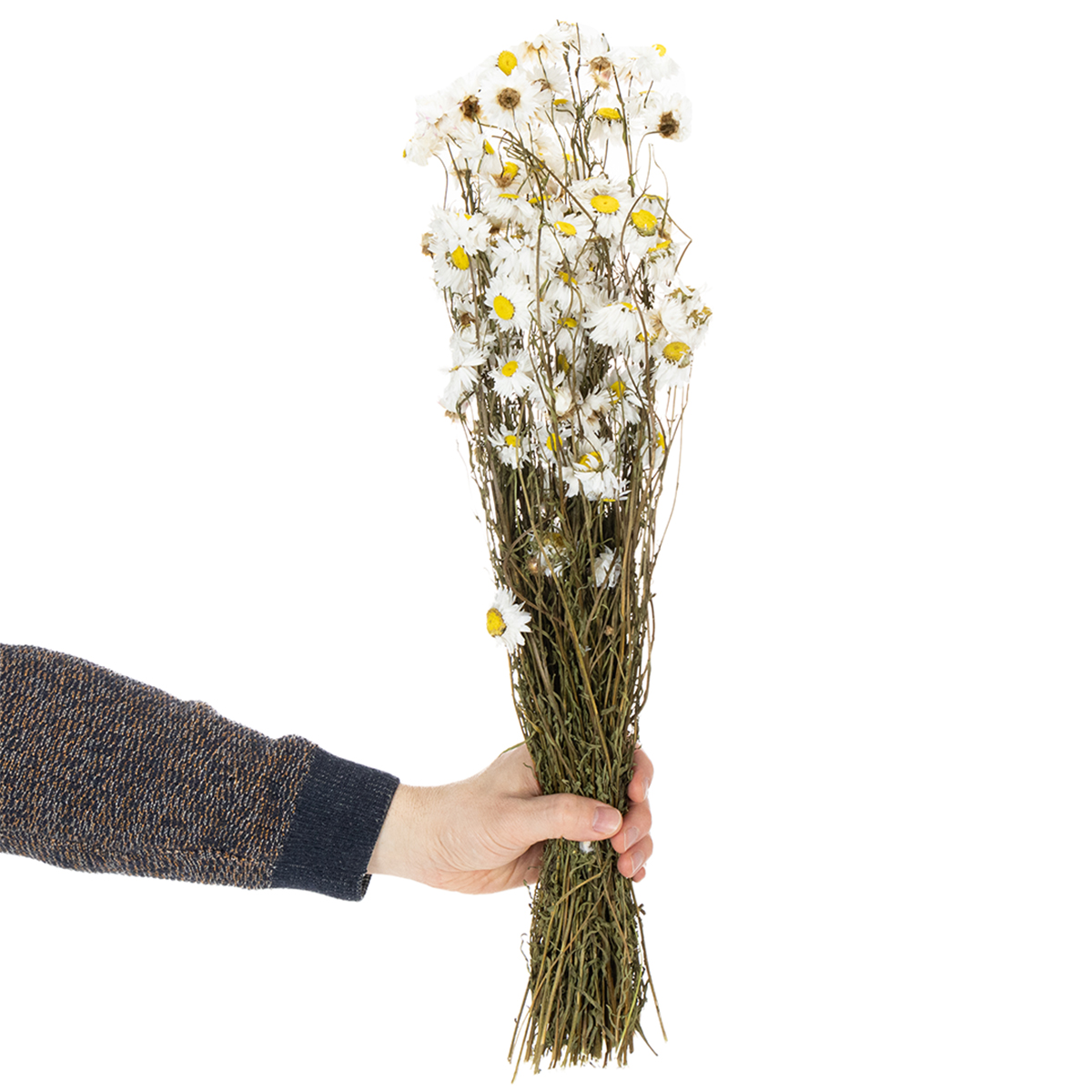 Valkoisine kukineen akroklinium näyttää kuvankauniilta kuivakukilta. Nämä kukat on huolellisesti valittu trendikkäisiin kuivakukka-asetelmiin, kuivattu hellävaraisesti värin säilyttämiseksi ja aseteltu kimppuun. Tämä luonnontuote ei vaadi kastelua ja on pitkäikäisyytensä ansiosta erityisen kestävä kukkakoriste.