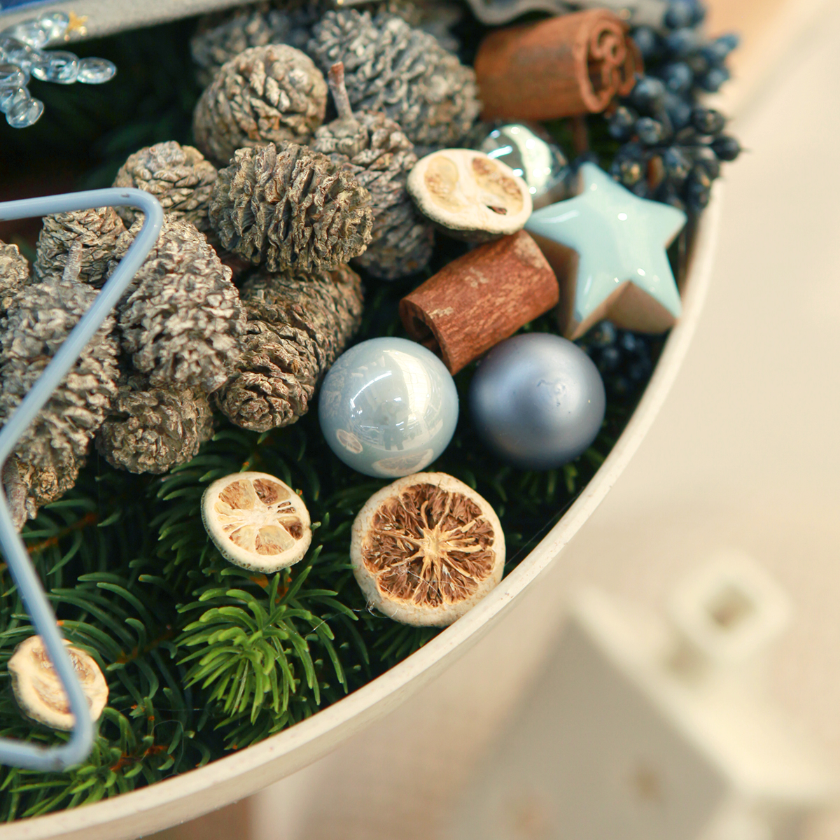 Materiaalit: Luonnonmateriaalit kuten käpyjä, puuta, kuorta, sammalta, oksia, lehtiä, kuivattuja kukkia, merilevää ja kookoskuitua.