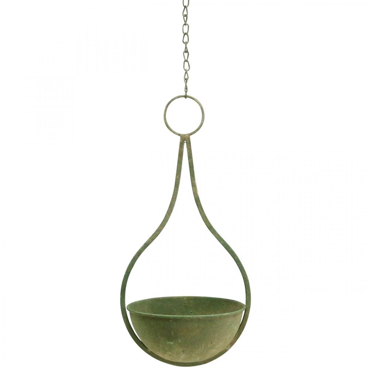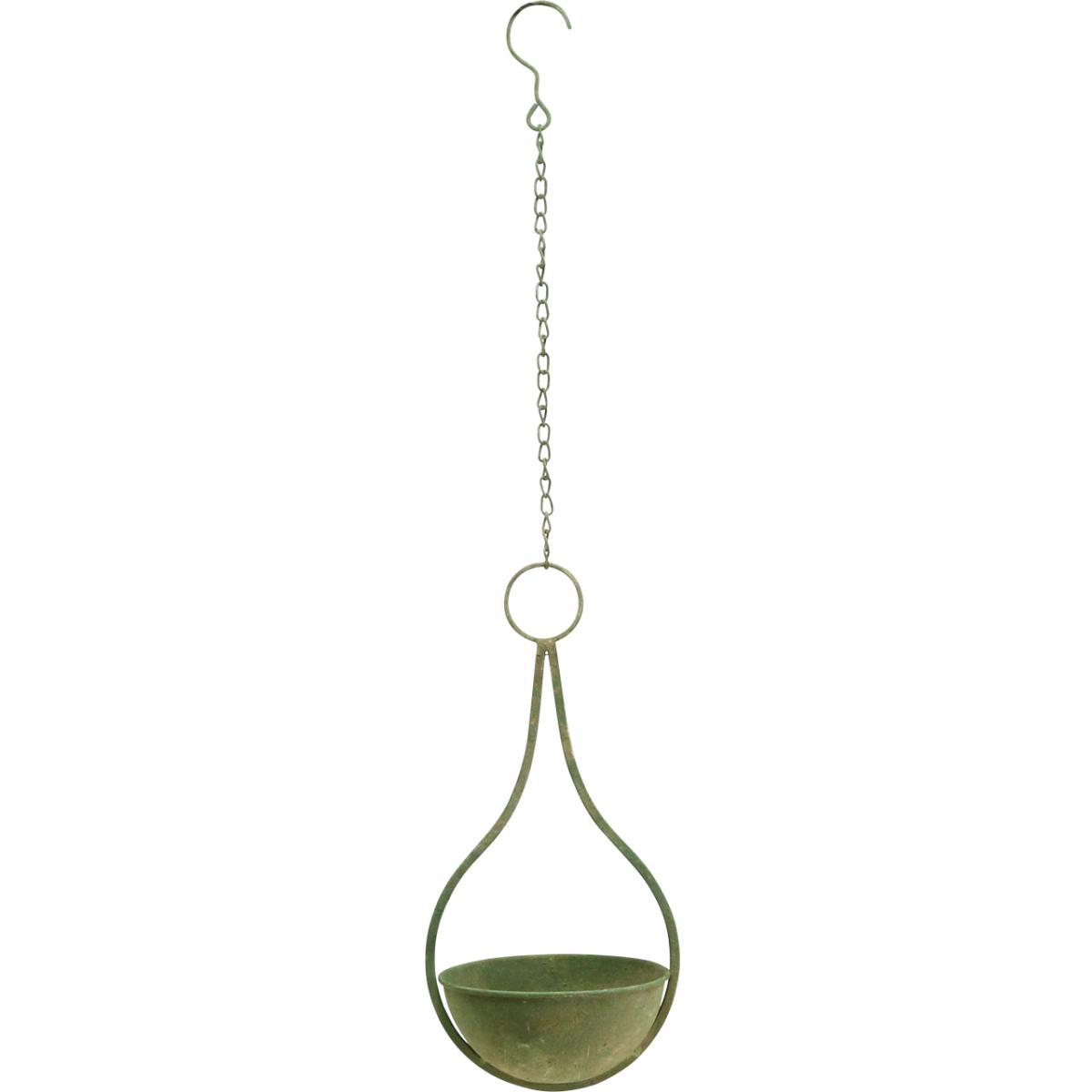 Metallinen ripustuskori koostuu pyöreästä kulhosta, jota pitää pyöreä kaari, joka yhtyy ylöspäin.