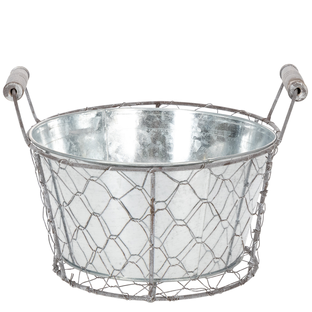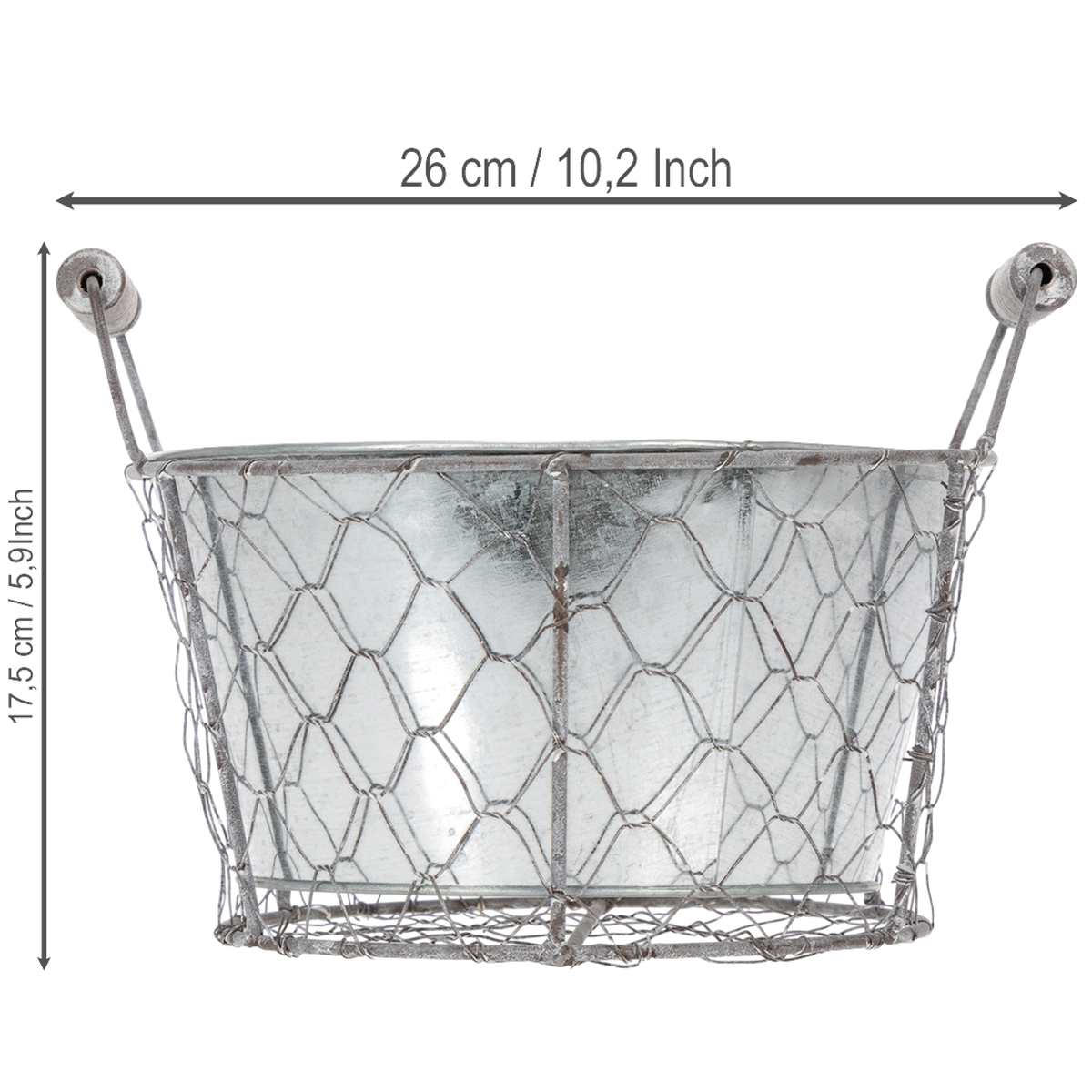 Metallikorissa on irrotettava metallitarjotin, jota voit käyttää yhdessä tai erikseen kukka-asetelmiin. Jos aiot istuttaa kukkia koriin, sinun tulee ehdottomasti vuorata metalliastia etukäteen foliolla. Tämä estää mullan ja veden valumisen ulos myöhemmin. Tällä tavoin kori sopii myös erinomaisesti kukka-asetelmien pohjaksi pöytäkoristeisiin. Lisää vain hieman leikattua kukkavaahtoa ja voit luoda upeita kevätkoristeita pääsiäiseksi tässä metallikorissa.