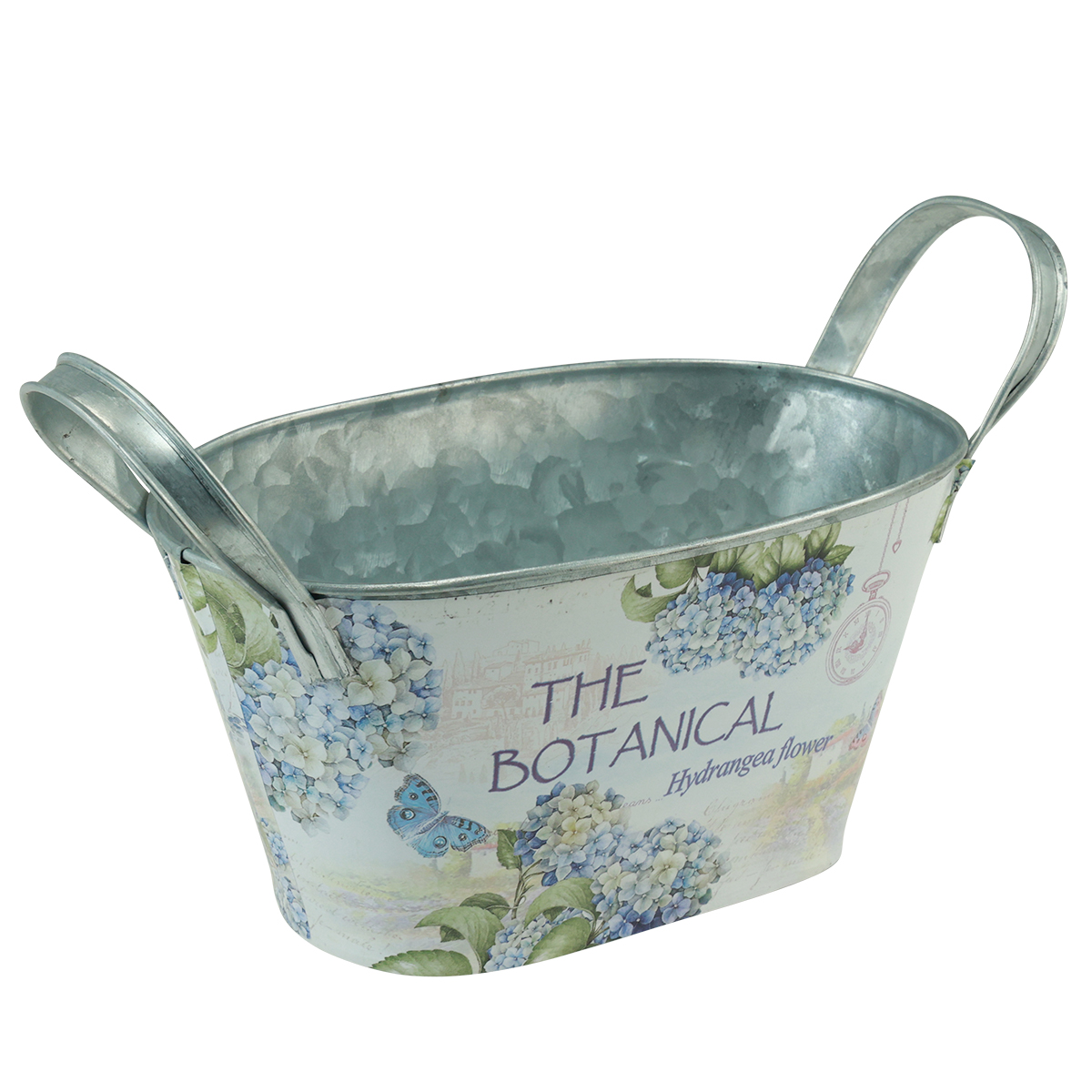 Soikea kahvojen kukkakulho on hurmaava tapa piristää kesääsi tyylikkäillä metallikoristeilla! Painatus sinisillä hortensioilla välittää lämpimien päivien tunteen puutarhassa.