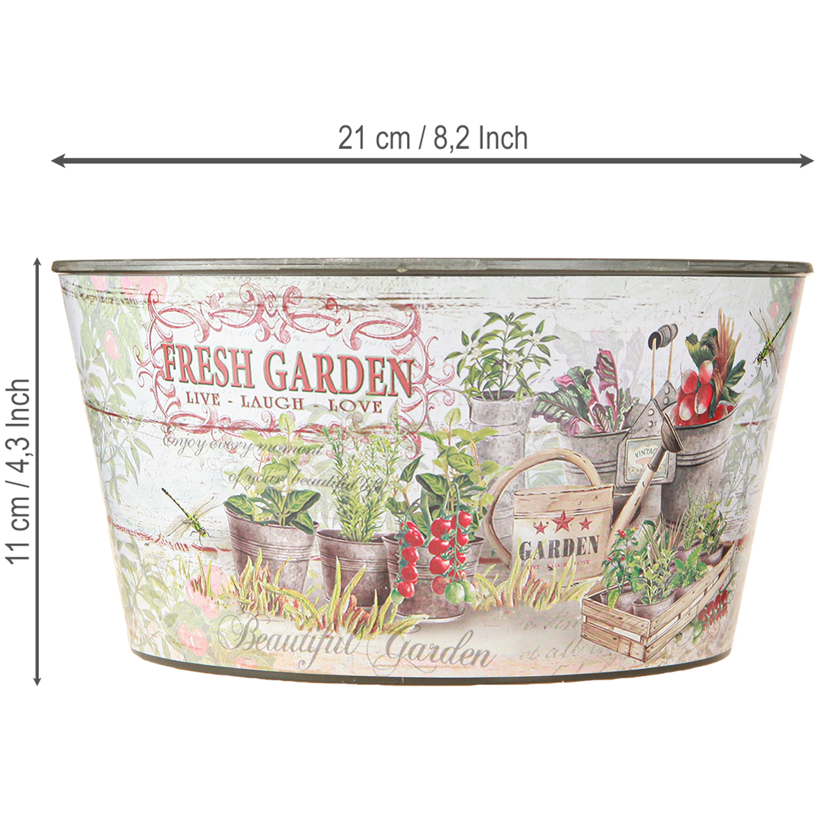 Laadukkaasta muovista valmistettu vintage-tyylinen kukkakulhomme, jossa on merkintä "Fresh Garden", on täydellinen lisä ulko- ja sisäkoristeeseesi. Halkaisijaltaan noin 21 cm ja kahdessa kappaleessa kulhot sopivat ihanteellisesti vintage-ihan ystäville. Värikäs muotoilu yhdistettynä puutarhatyökaluja, istutuskoneita, hedelmä- ja vihanneskasveja sekä yrttiruukkuja esittelevään aiheeseen tuo kevään ja kesän tunnelmaa kotiisi tai puutarhaan. Tekstissä "Fresh Garden – Live – Laugh – Love" on tyylikäs vintage-design ja se sulautuu harmonisesti kevään tai kesän pöytäkoristeisiin. Tämä korkealaatuisesta muovista valmistettu kukkakulho ei ainoastaan tarjoa visuaalisia kohokohtia, vaan on myös kestävä ja vankka. Olipa kyseessä kukkaruukku, istutuskone tai yrttiruukku, kukkakulhomme säteilevät kutsuvaa puutarha- ja parvekekoristetta.
