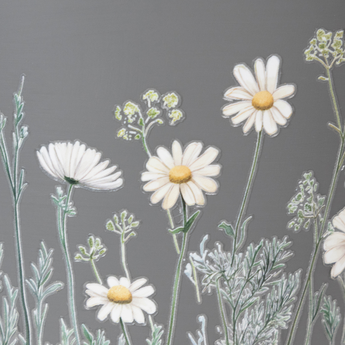 - Suunnittelu: Herkät luonnonkukat harmaalla lakatulla metallilla