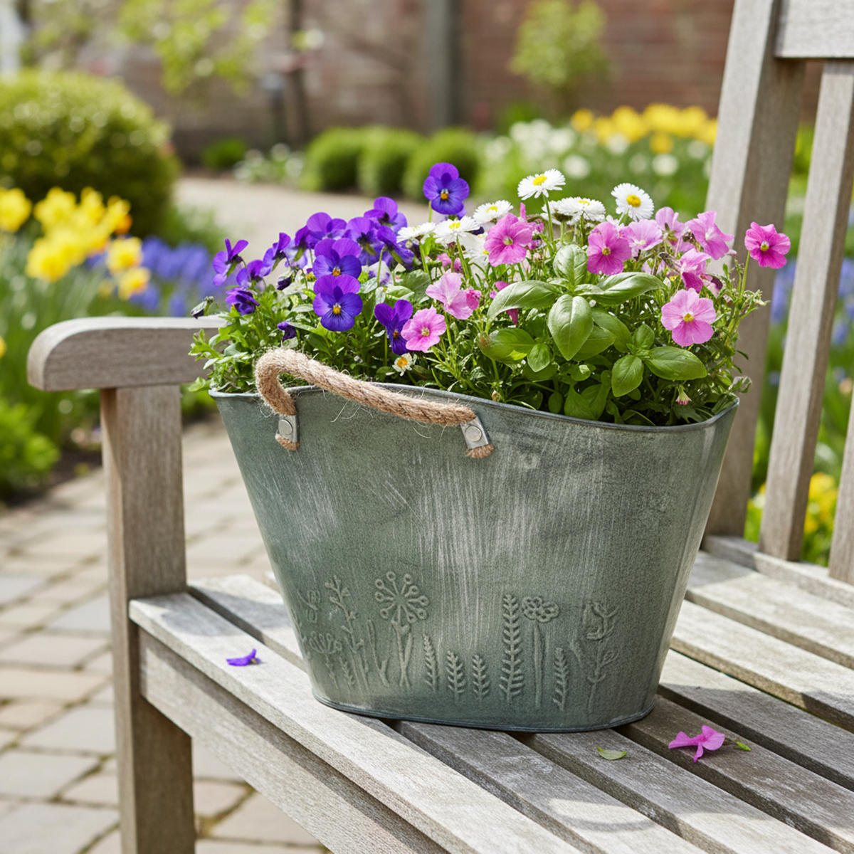 Jos haluat vieläkin enemmän kukkakoristeluja metalliistuttimissa, suosittelemme yhdistämään tämän kahvoilla varustetun kukkaruukun ja suuremman istutuspöydän taskumalliin!