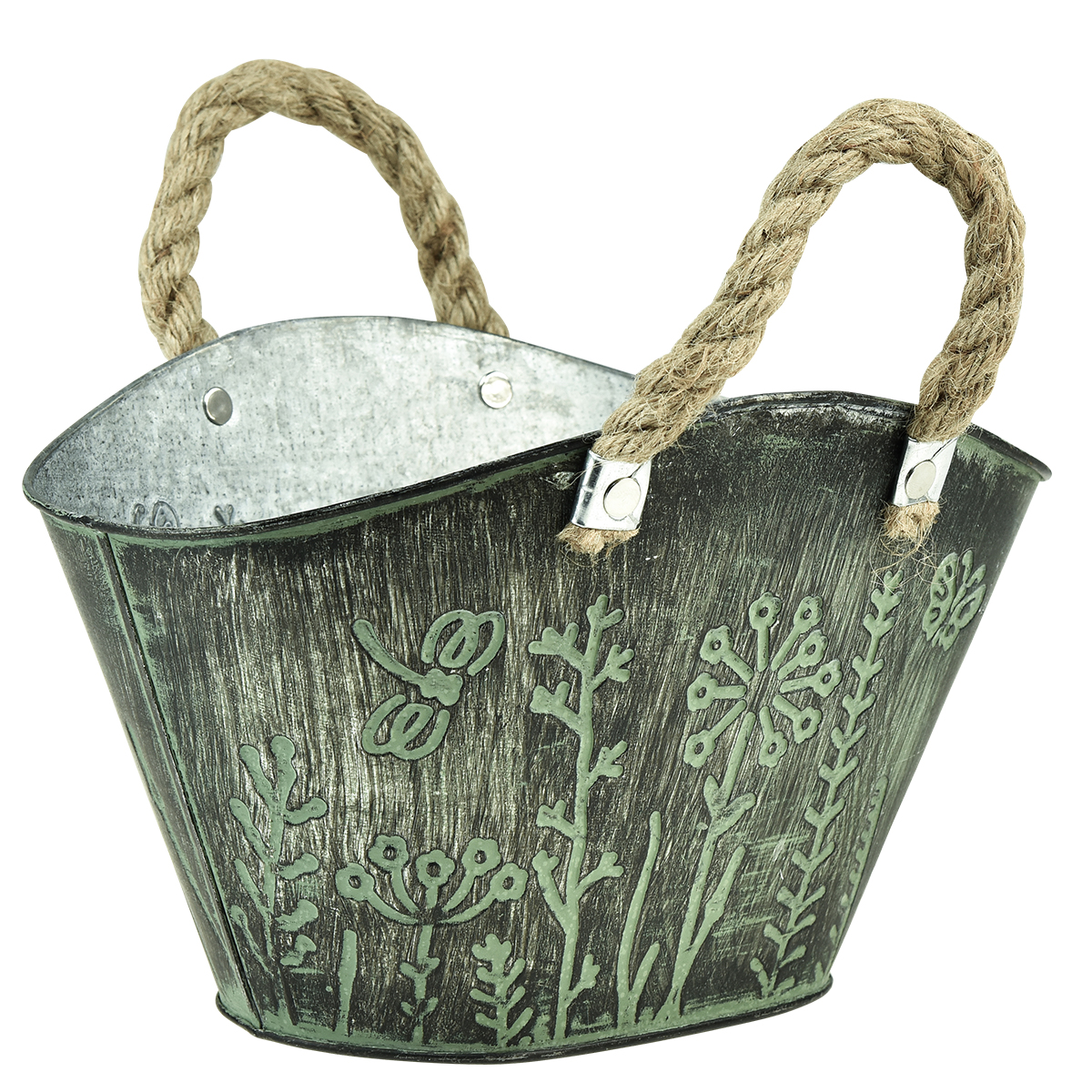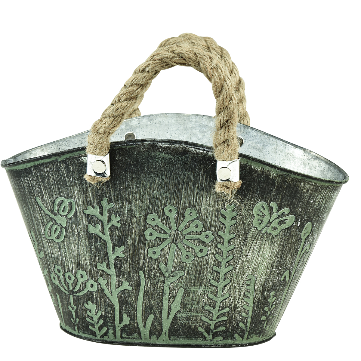 Istutuskone on kudotun ostoskassin muotoinen ja näyttää erittäin rennolta. Ulkopuolelta metalliruukku on käsitelty vihreällä ja tummanharmaalla ja ulkonäköä leimaa tyylitelty villikukkaniitty. Luonnonkuidusta valmistetut punotut kädensijat tekevät loput soikeasta kukkaruukasta erittäin erikoisen kappaleen.