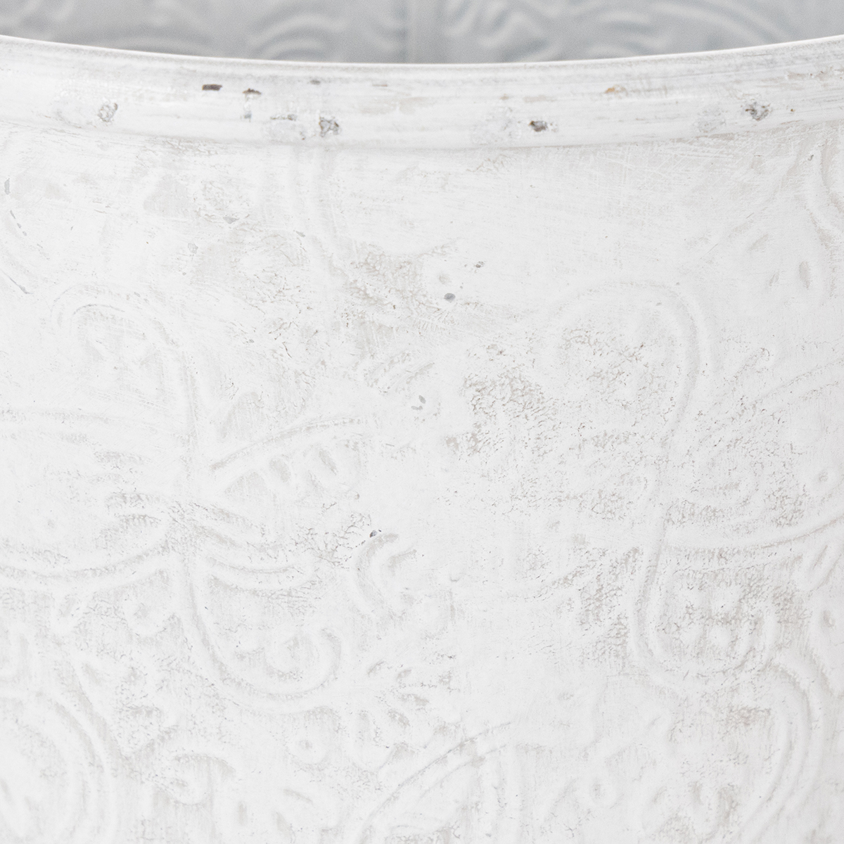 Satumainen kätköpurkki on koristeltu koristeilla: metallikoristeen ympärillä on kukkakukkia. Romanttisen ilmeensä ja trendikkäässä shabby chicissä olevan valkoisen pesun ansiosta metalliastia sopii mainiosti myös vintage-tyyliseen pöytäkoristeeseen häiden kukkakoristeeksi!