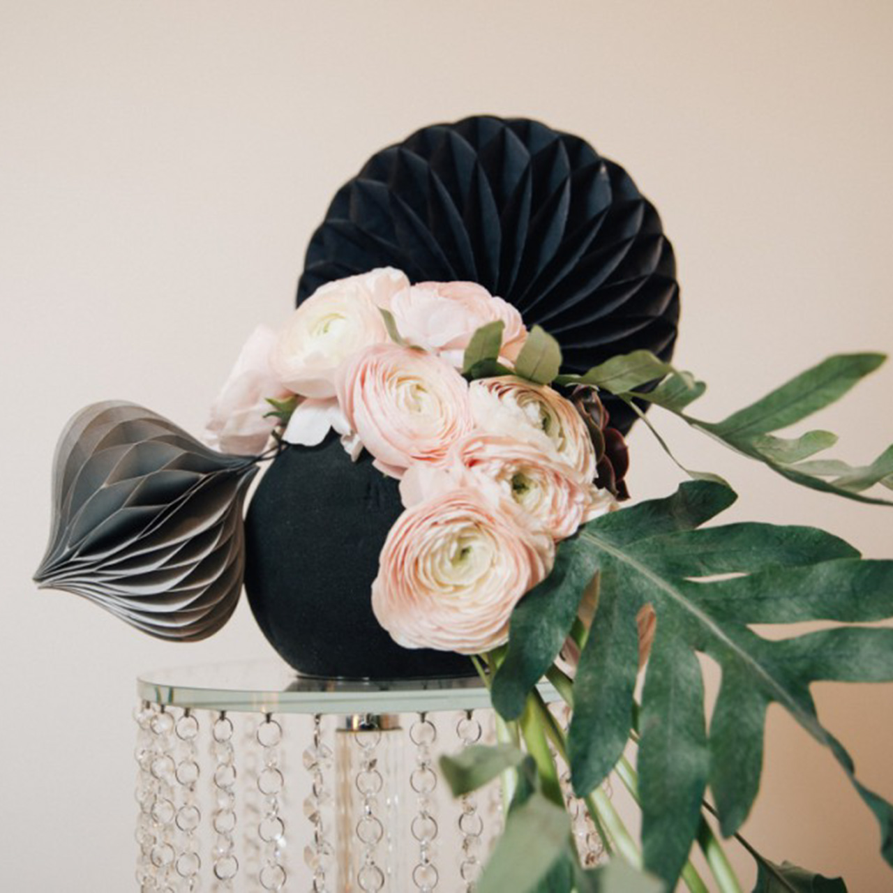 OASIS® Ideal Black -sarjan mustan sammalpallon halkaisija on noin 20 senttimetriä. Saat koristeellisen pallon kutistettuna muovipakkaukseen.