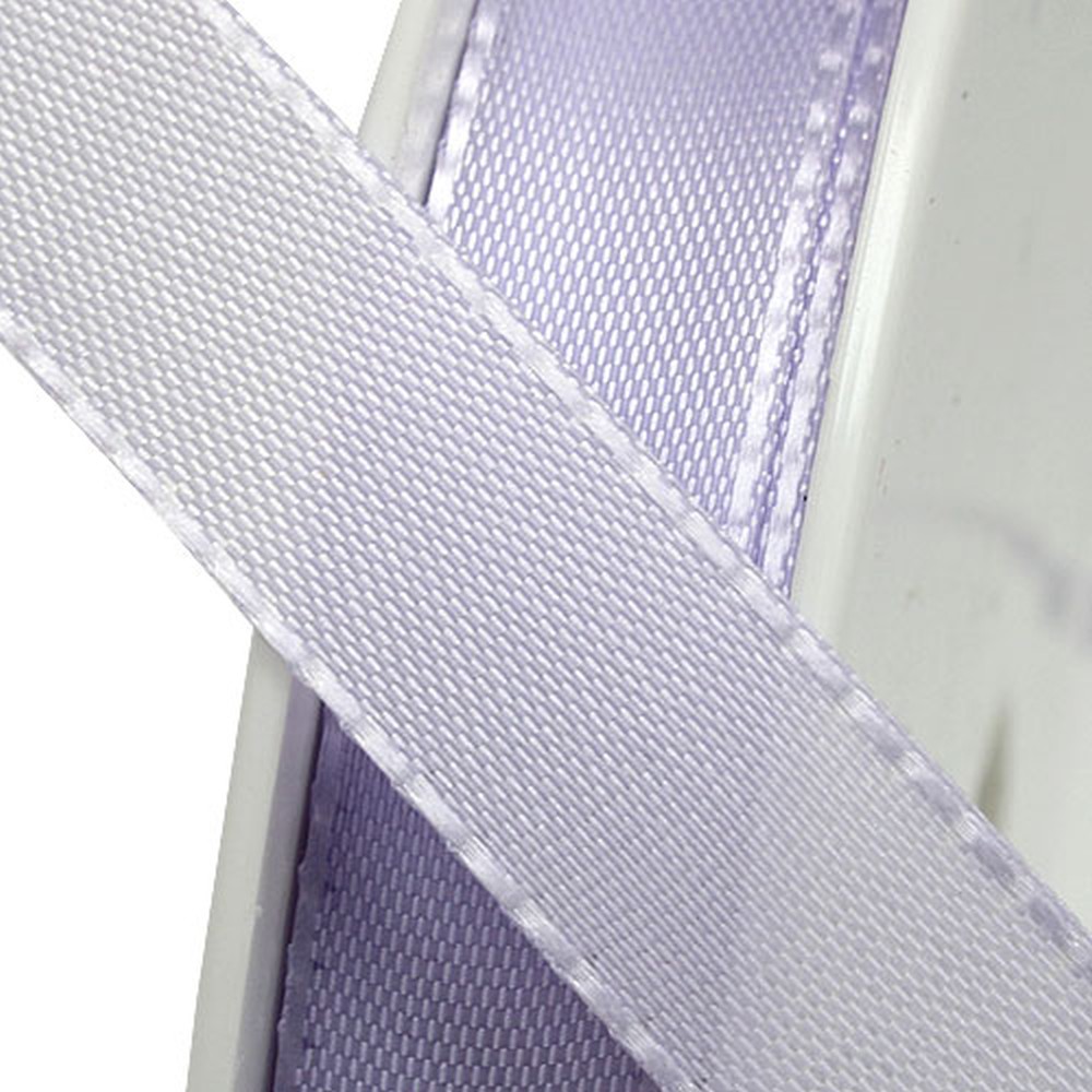 Lahja- ja koristenauha vaalean lilan värisenä on kelattu muovirullalle ja sen pituus on noin 50 metriä ja leveys noin 15 millimetriä.