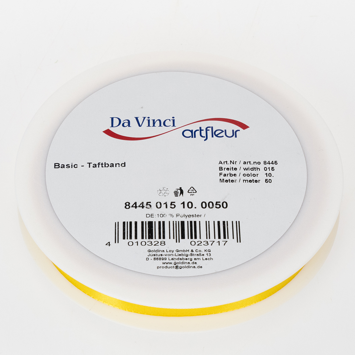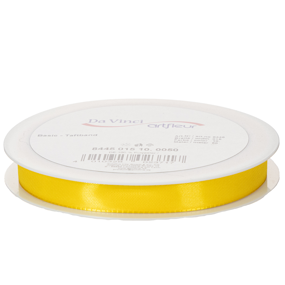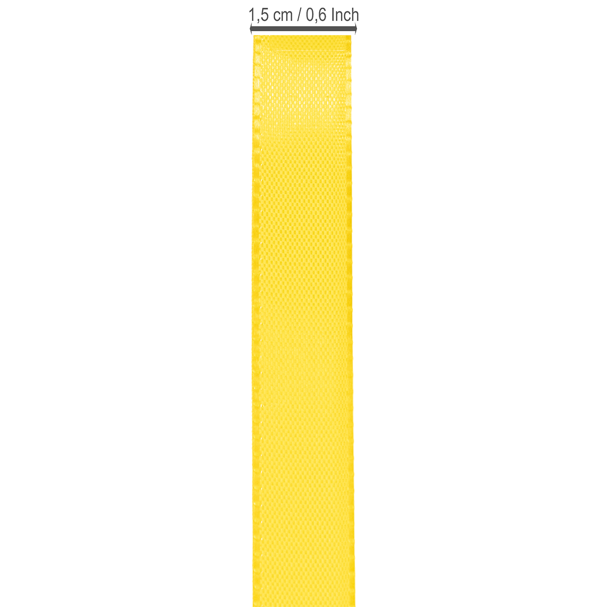 Keltainen lahja- ja koristenauha on valmistettu 100 % polyesteristä, ja sen leveys on noin 15 millimetriä ja pituus noin 50 metriä. Se on kierretty kätevälle muovikelalle.
