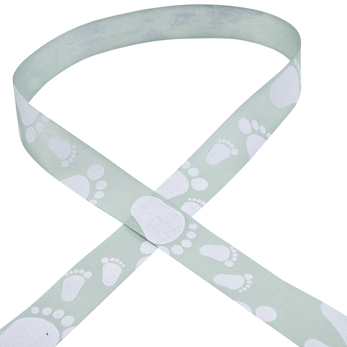Kangasnauhan vaaleaa, pastellinvihreää taustaa koristavat pienemmät ja suuremmat jalanjäljet. Valkoisena vauvan jalat muodostavat kauniin kontrastin koristenauhan värille ja vangitsevat taitavasti iloisen tapahtuman teeman.