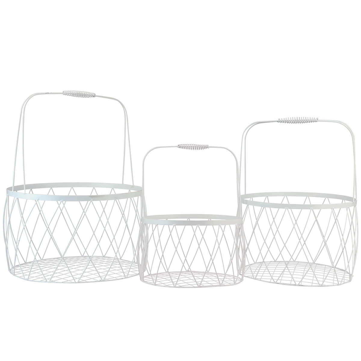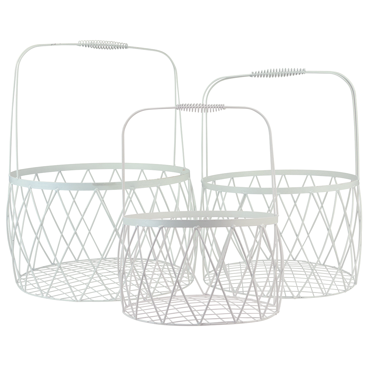 Valkoiset metallikorimme ovat jotain erityistä. Valkoisten korien palkit muodostavat suorakulmioita, mikä on jännittävä kontrasti korien pyöreän muodon kanssa. Korin kahva spiraalimaisella muotoilulla on myös todellinen katseenvangitsija. Päästä luovuutesi valloilleen ja tuo kevään ripaus kotiisi tai yritykseesi näiden korien avulla.