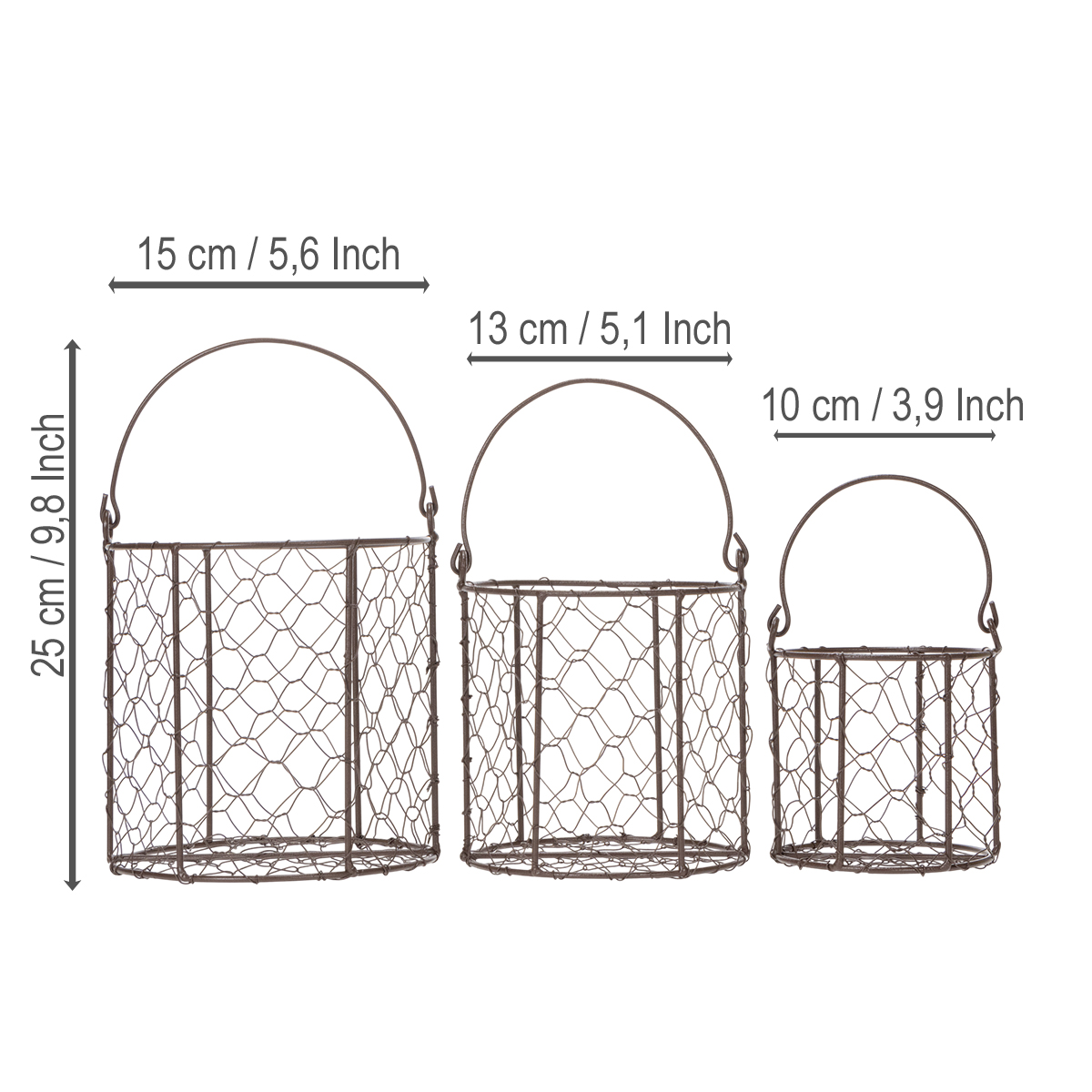 Tämä kolmen metallikorin setti on täydellinen valinta. Ne on valmistettu tukevasta metallista ja poikkeuksellisen kestävät hienon verkkonsa ansiosta, joten ne sopivat täydellisesti mihin tahansa moderniin kotiin. Halkaisijaltaan 15 cm (iso kori) ja korkeudeltaan 25 cm ne sopivat käytännössä kaikkeen, mitä haluat pitää järjestyksessä. Hedelmät ja vihannekset? Ei hätää. Keittiövälineet tai kangaslautasliinat? Täydellisiä. Vai haluatko ehkä koristeellisen silauksen? Kasviasetelmat ja kukat saavat koreissaan erityisen viehätyksensä esiin. Pyöreän muotonsa ja tukevan kantokahvansa ansiosta korit on helppo siirtää huoneesta toiseen tai puutarhaan. Jokainen vintage-tyylin ystävä lumoutuu niistä välittömästi. Ruskea väri varmistaa, että setti sulautuu harmonisesti mihin tahansa sisustukseen – skandinaavisesta minimalismista maalaistyyliin. Korit näyttävät erityisen hyviltä yhdistettynä muihin luonnonmateriaaleista valmistettuihin koriste-elementteihin. Mikset kokeilisi niitä?