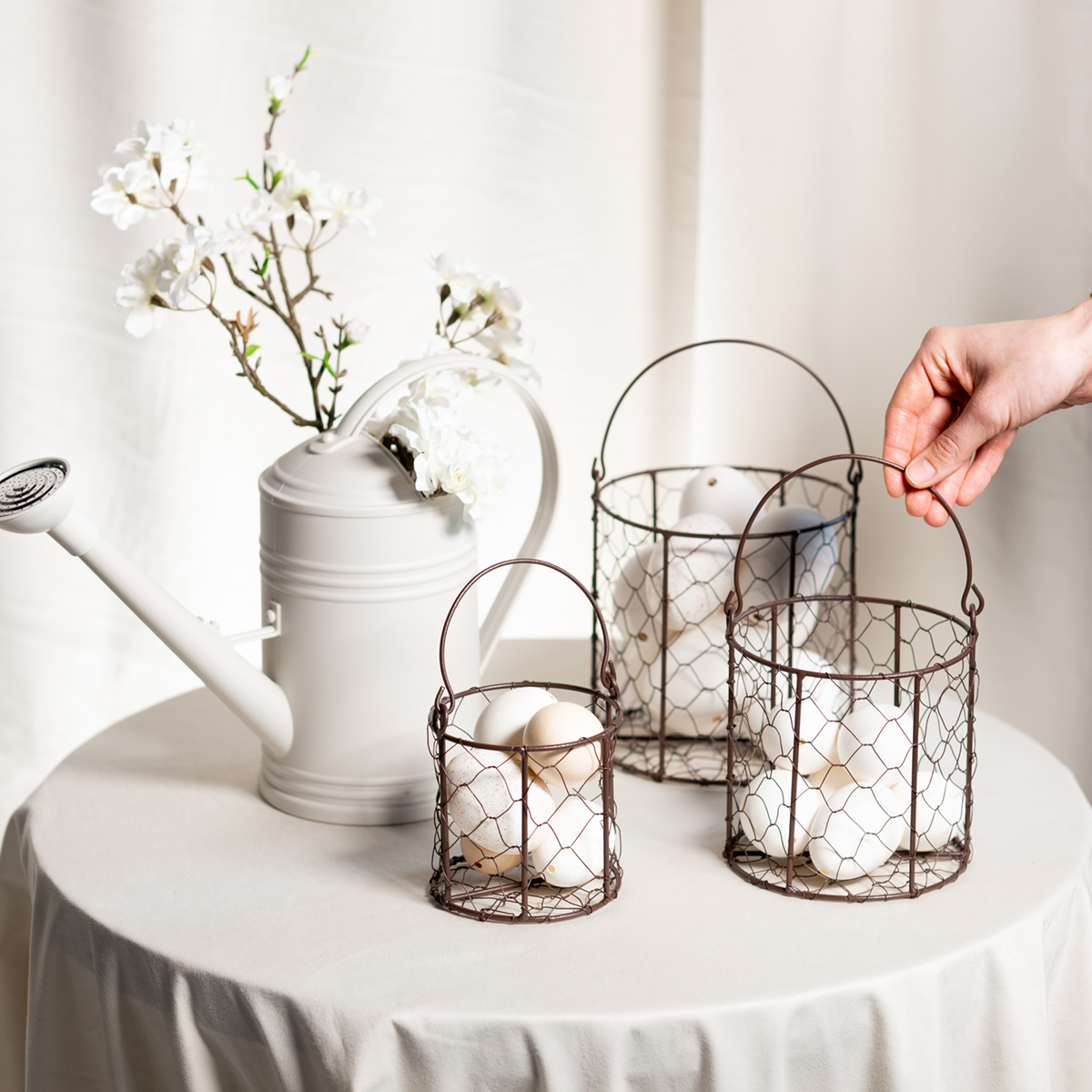 Tämä kolmen metallikorin setti on täydellinen valinta. Ne on valmistettu tukevasta metallista ja poikkeuksellisen kestävät hienon verkkonsa ansiosta, joten ne sopivat täydellisesti mihin tahansa moderniin kotiin. 15 cm:n halkaisijan (suurin kori) ja 25 cm:n korkeuden ansiosta kasviasetelmat ja kukat loistavat näissä koreissa todella. Pyöreän muotonsa ja tukevien kahvojensa ansiosta koreja on helppo kantaa huoneesta toiseen tai puutarhaan. Jokainen vintage-tyylin ystävä lumoutuu niistä välittömästi. Ruskea väri varmistaa, että setti sulautuu harmonisesti mihin tahansa sisustukseen – skandinaavisesta minimalismista rustiikkiseen maalaistyyliin. Korit näyttävät erityisen hyviltä yhdistettynä muihin luonnonmateriaaleista valmistettuihin koriste-elementteihin. Mikset kokeilisi niitä?