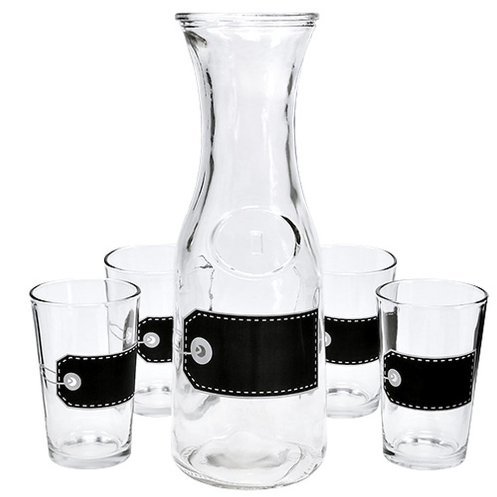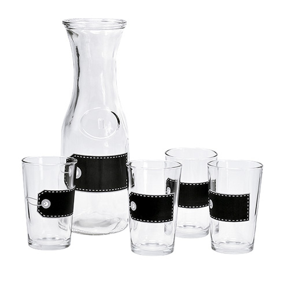 Siten voit tarjoilla lasiastiassa paitsi virkistävää ja kuohuvaa vettä, myös ihanan tuoksuista punaviiniä tai jopa kultaista, hienoa rommia ja ilahduttaa vieraita sillä. Karahvin ja lasien painatus on myös melko hienostunut, ja se näyttää mustalta etiketiltä harmaassa narussa.