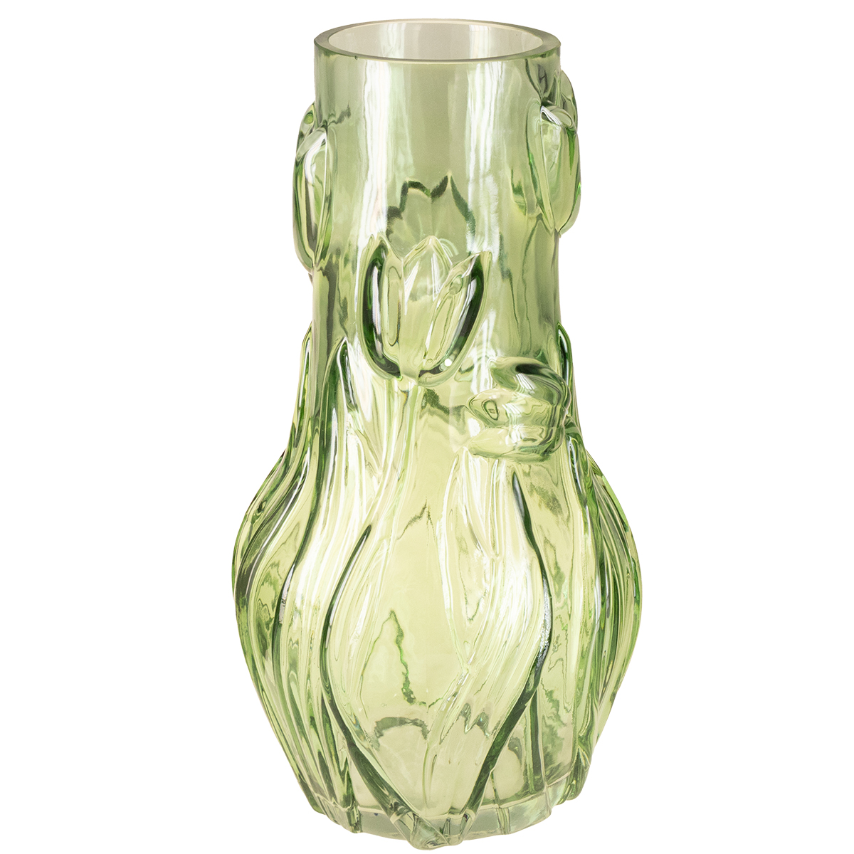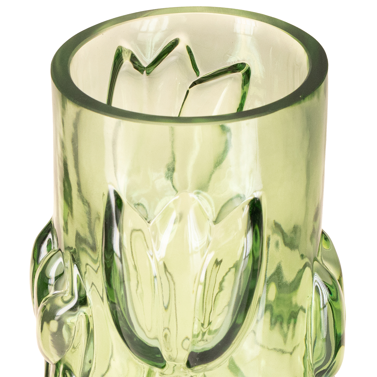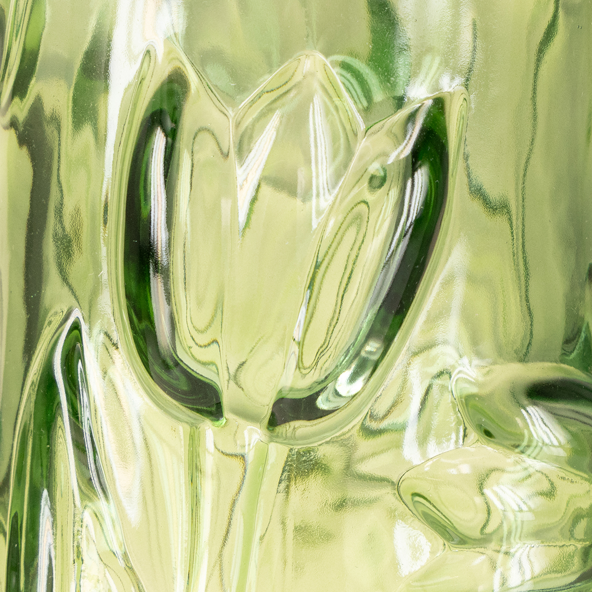 Tämä 30 cm korkea lasimaljakko kirkkaan vihreällä sävyllään lumoaa ajattoman elegantilla luonteellaan. Sen ainutlaatuinen tulppaanikuvio tuo ripauksen luontoa suoraan kotiisi. Kimaltelevan lasin ja pehmeän vihreän sävyn yhdistelmä lisää hienovaraisia väriaksentteja olematta kuitenkaan liian voimakas. Halkaisijaltaan 16 cm oleva maljakko tarjoaa runsaasti tilaa reheville kukka-asetelmille näyttämättä kuitenkaan liian ahtaalta.