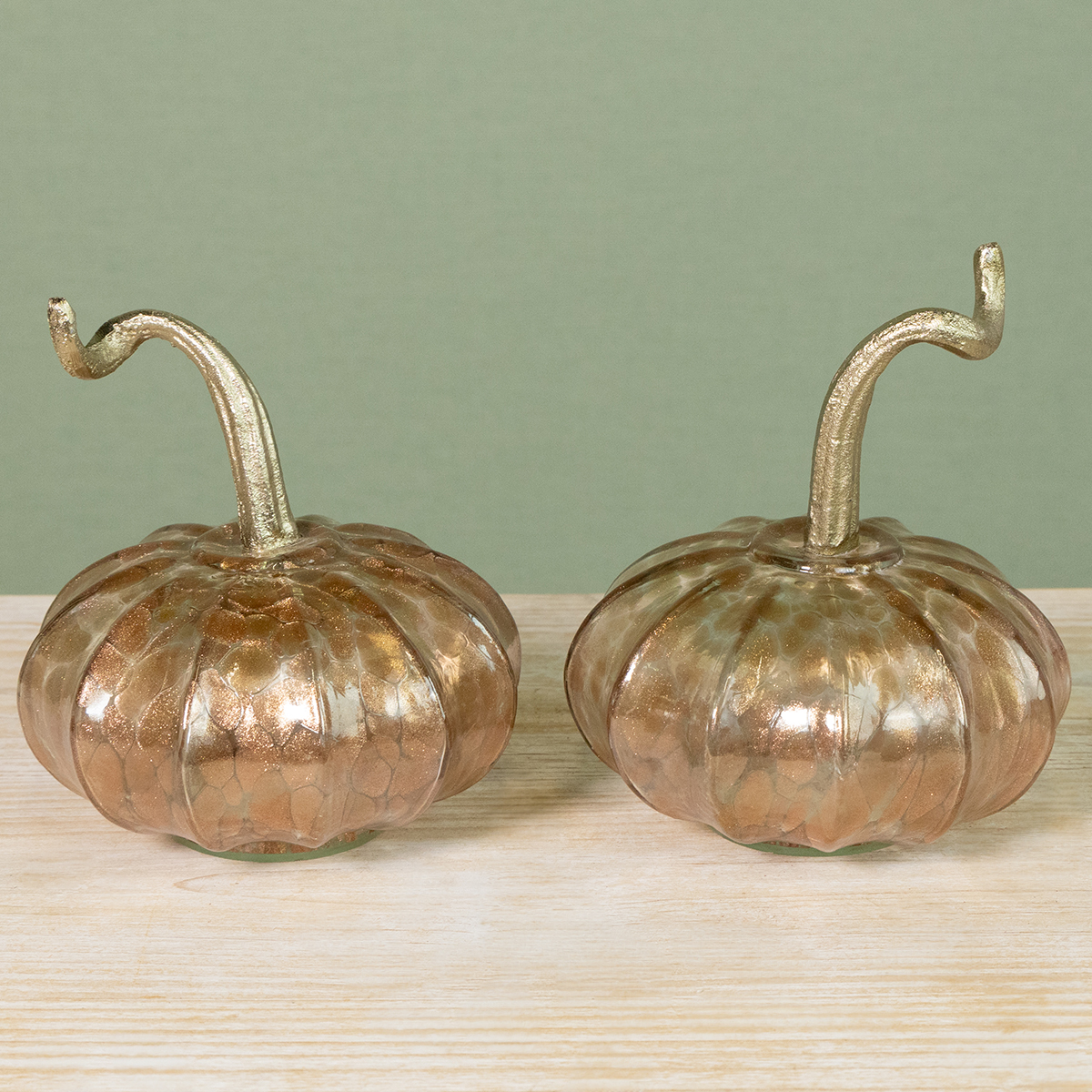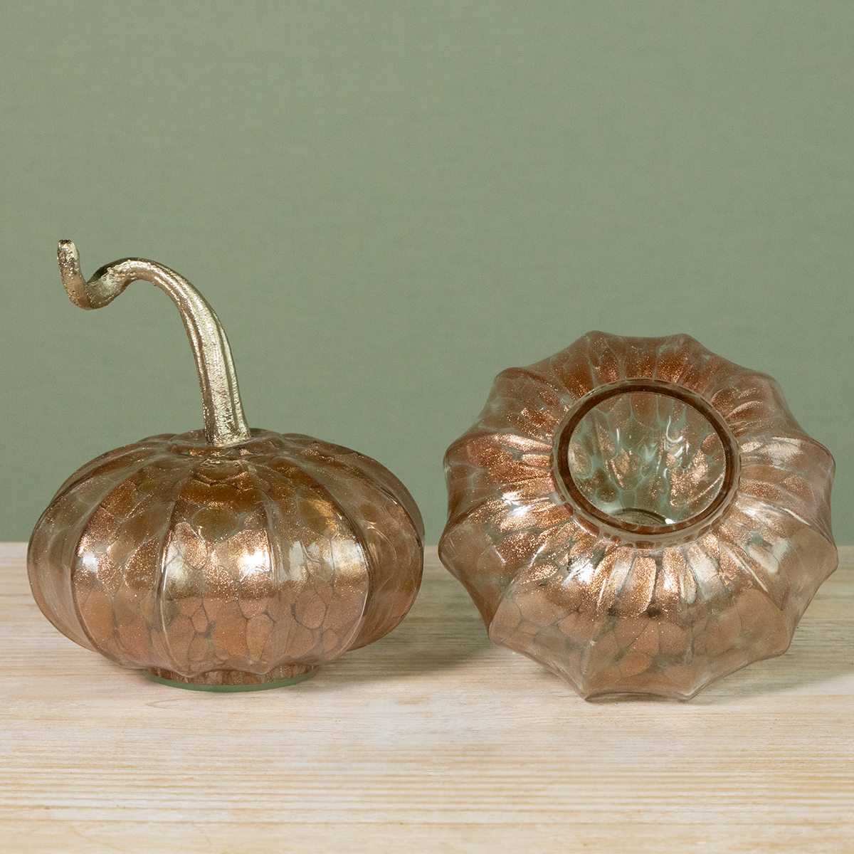 Lasinen kurpitsapöytäkoriste, syyskurpitsa, lasia ja metallia, 14 cm korkea, 2 kpl