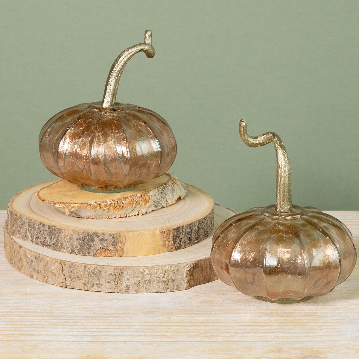 Lasinen kurpitsasetti tuo syksyn tunnelman suoraan kotiisi. Korkealaatuisten lasikurpitsojen huolellinen valmistus ja elegantit metalliosat tekevät jokaisesta kappaleesta pienen veistoksen. Erityisen vaikuttavaa on pinnan herkkä tekstuuri, joka heijastaa valoa kiehtovalla tavalla ja lisää samalla ripauksen glamouria. Lämmin kuparin ja kullan värimaailma korostaa syksyistä tunnelmaa – korkealaatuinen ja harmoninen, täydellinen viihtyisiin iltoihin.