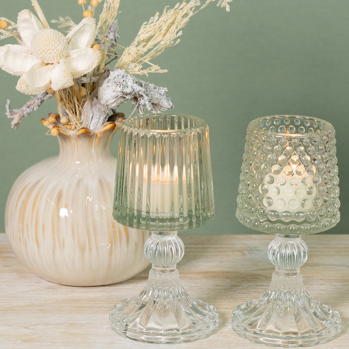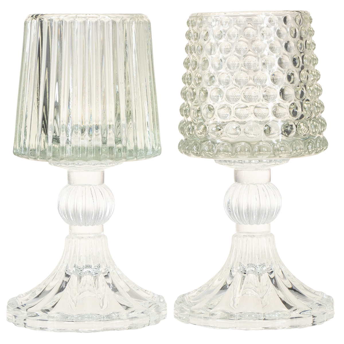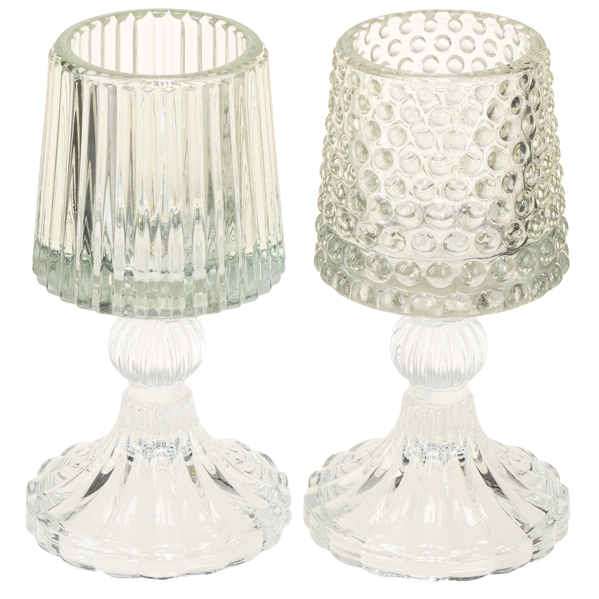 Etsitkö viehättävää tapaa kohentaa kotiasi ripauksella vintage-glamouria? Nämä lasiset tuikkujalat jalustalla, elegantissa kahden kappaleen setissä, yhdistävät klassisen kauneuden moderniin toimivuuteen. Olipa kyseessä romanttinen ilta, juhlava kattaus tai vain tyylikäs lisä olohuoneeseesi, nämä kynttilänjalat varmasti kääntävät katseita! Hienojen pisteiden ja teksturoitujen urien yhdistelmä lisää ainutlaatuisen hienostuneisuuden mihin tahansa huoneeseen. Teksturoitu lasi on erityisen kaunis kynttilänvalossa luoden lämpimän ja kutsuvan tunnelman.
