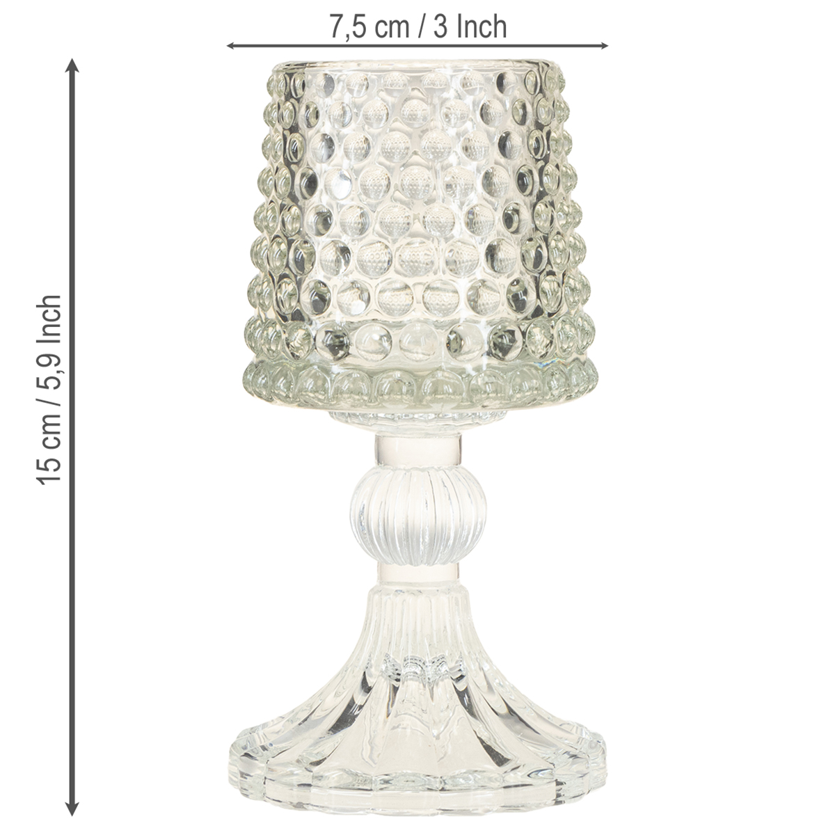 Tuotteen nimi: Lasinen tuikkupidike, jossa pistemäiset ja uralliset pohjaosat, korkeus 15 cm, 2 kpl