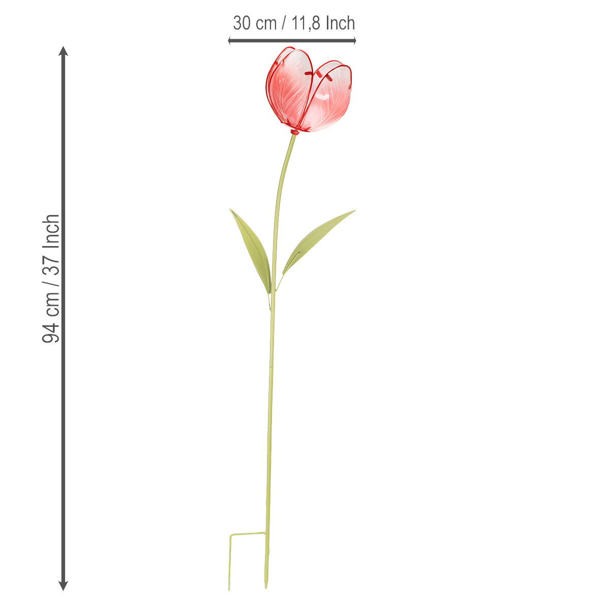 Lasinen tulppaanivarsi tekee vaikutuksen paitsi esteettisellä muotoilullaan. Reilulla 94 cm korkeudellaan ja 13 cm halkaisijallaan se tuo näyttävän yksityiskohdan mihin tahansa ulkotilaan. Kirkkaanpunainen tulppaani on valmistettu tukevasta lasista, joka on sekä säänkestävä että pitkäikäinen (vaikkakaan ei pakkaselta suojattu).