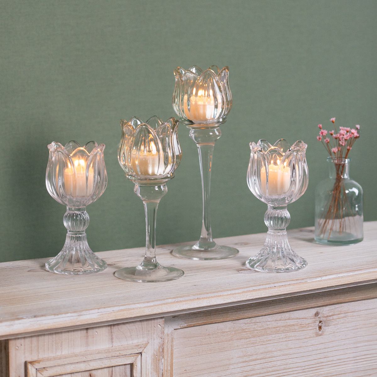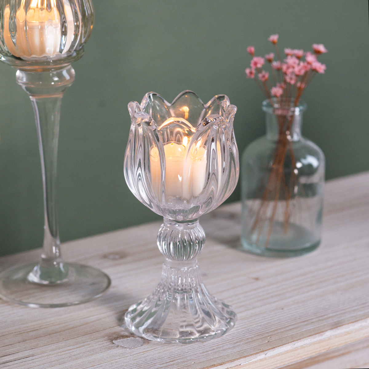 Lasinen kynttilänjalka pöytäkoriste – eleganssia kukkamuodossa