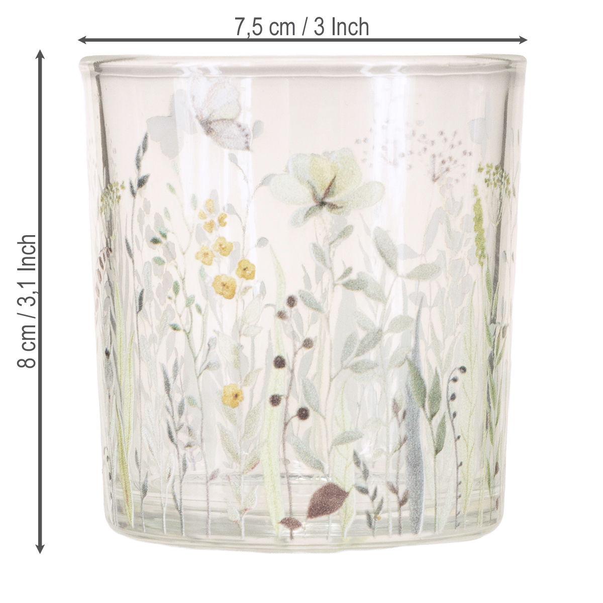 - Materiaali: Korkealaatuinen lasi, jossa on värikäs perhos- ja kukkakuvio