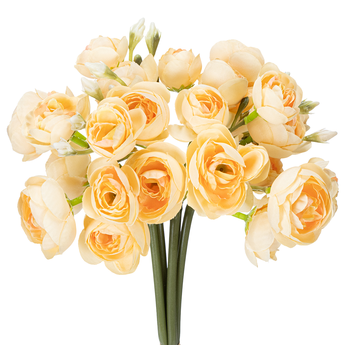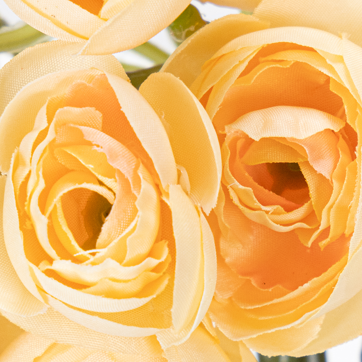 Tämä taidokkaasti valmistettu leinikkikukka tekee vaikutuksen korkealaatuisella työllään – ihanteellinen kaikille, jotka rakastavat luonnonkukkien viehätystä, mutta eivät halua niiden hoitamisen vaivaa. Viisi hienovaraisesti työstettyä oksaa ovat lämpimän oranssit, väriltään jotka säteilevät sekä iloa että kodikkuutta. Realistisen tekstuurinsa ansiosta kukat näyttävät petollisen aidoilta ja tuovat elegantin, lähes runollisen silauksen mihin tahansa huoneeseen. Polyesteri- ja muovimateriaalit ovat erityisen kestäviä, mikä tekee leinikkikukasta luotettavan lisän sisustukseesi vuosiksi eteenpäin. Moderni muotoilu sopii yhteen monenlaisten tyylien kanssa – skandinaavisesta minimalistisesta romanttiseen maalaistyyliin. Leinikkikukka voidaan yhdistää täydellisesti muiden tekokukkien tai kausikoristeiden kanssa. Vinkki: Kimpussa on erityisen upea ilme kapeassa, valkoisessa tai lasisessa maljakossa. Olipa kyseessä sitten koristeellinen kohokohta olohuoneen pöydällä, luova katseenvangitsija kuivakukka-asetelmassa tai romanttinen silaus hääpöytiin – nämä tekoleinikkikukat ovat monipuolisia ja helppokäyttöisiä. Harmonisen kokonsa ja harkitun muotoilunsa ansiosta oksa näyttää aina upealta, olipa se sitten esillä yksinään tai yhdessä muiden kukkakoristeiden kanssa!