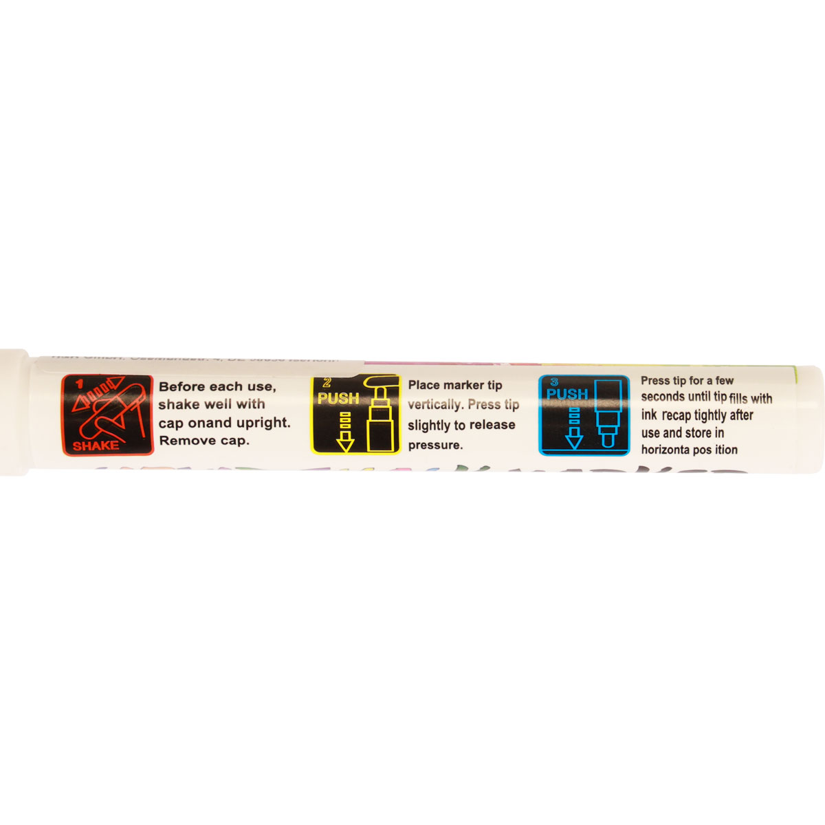 Tarkan luodin kärjen ansiosta valkoinen viiva tarjoaa joustavuutta kaikkiin projekteihisi. Tämän liitukynän vesiliukoinen, vesipohjainen muste takaa helpon levityksen ja sujuvan kirjoituskokemuksen, mutta mahdollistaa myös viestien pyyhkimisen kostealla liinalla milloin tahansa.