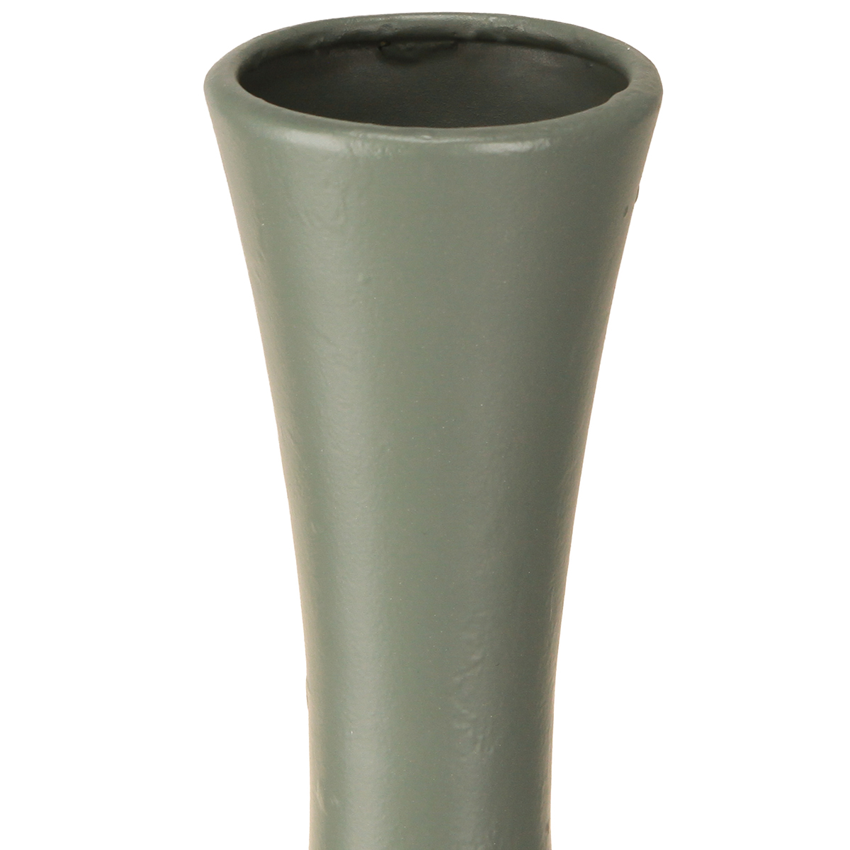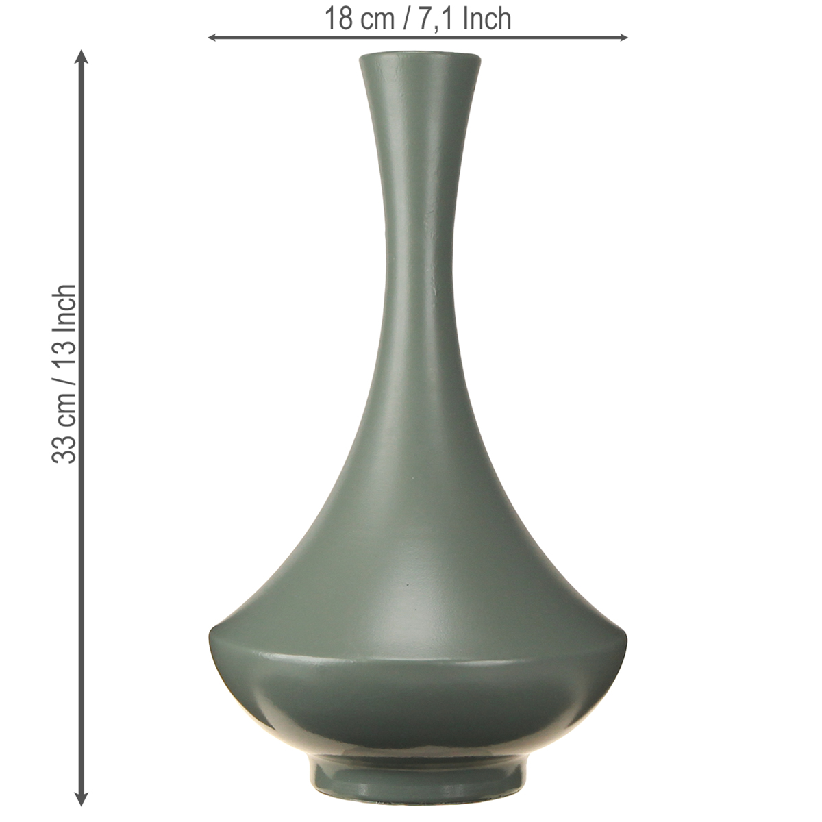 Tämä koristeellinen maljakko lumoaa harmonisesti kaarevalla muodollaan ja korkealaatuisella metallityöllään. Mattavihreä viimeistely on sekä hillitty että elegantti ja korostaa sen modernia luonnetta. Olipa kyseessä sitten ruokailutilan keskipiste, lipaston koristeellinen aksentti tai tyylikäs elementti toimistopöydällä, sen monipuolisuus tekee siitä välttämättömän asusteen mihin tahansa kotiin. 33 cm korkeana se on täydellisen kokoinen sulautumaan saumattomasti mihin tahansa huoneeseen ja tekemään silti vaikutuksen. Minimalistista estetiikkaa arvostavat tulevat rakastamaan sitä – mutta se toimii kauniisti myös muiden koriste-esineiden kanssa.
