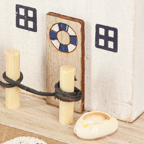 Tyylikkään rantamökin merihenkisen sisustuksen ansiosta kodistasi tulee hyvinvoinnin keidas. Tämä rakkaudella suunniteltu koristeellinen rantataloyhdistelmä perustuu luonnonmateriaaleihin ja autenttisiin elementteihin, jotka luovat erehtymättömän meren tunnelman. Koristeelliset rantatalot sinisen, valkoisen ja luonnonvärisenä ovat ihanteellinen katseenvangitsija kotiisi, olipa se sitten merimaisena koristeena vitriiniin, kylpyhuoneeseen tai pöytäkoristeena kesätapahtumiin. Kaksi kauniisti suunniteltua taloa sijaitsevat aidosta rantaesenssistä tehdyllä alustalla: hieno rantahiekka koristaa hiekoitettua reunaa. Valkoisen puutalon korkeaa rakennetta yksityiskohtaisine mustamaalatuine ikkunoineen täydentää täydellisesti rakkaudella maalattu pienempi sininen talo. Molemmissa rakennuksissa on aidot kuoret ja taidokkaasti kääritty ohuesta paperilangasta valmistettu minikaide. Jokainen järjestely on ainutlaatuinen, minkä takaavat kuorivalikoima ja yksilöllisesti kääritty minikaide. Tämä rantatalokoristelu, jota täydentävät harmonisesti kattojen luonnolliset puurakenteet, antaa jokaiseen huoneeseen merellisen tunnelman.
