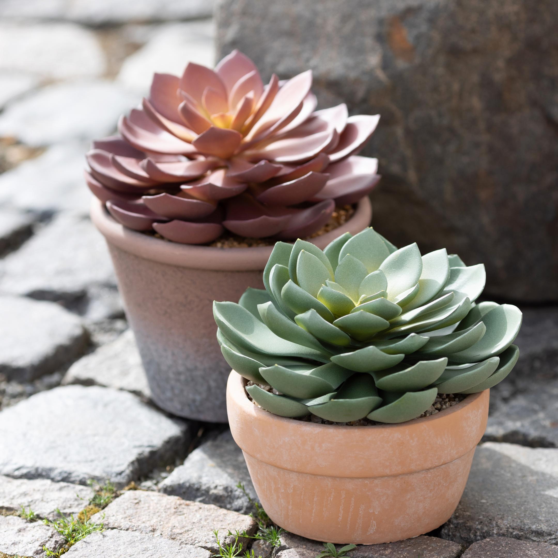 Tämä ruukussa oleva mehikasvi on saatavana myös tekokasvina punaisena ja isompana - luo keinotekoisia kasvikoristeita kuin ne olisivat kasvaneet.