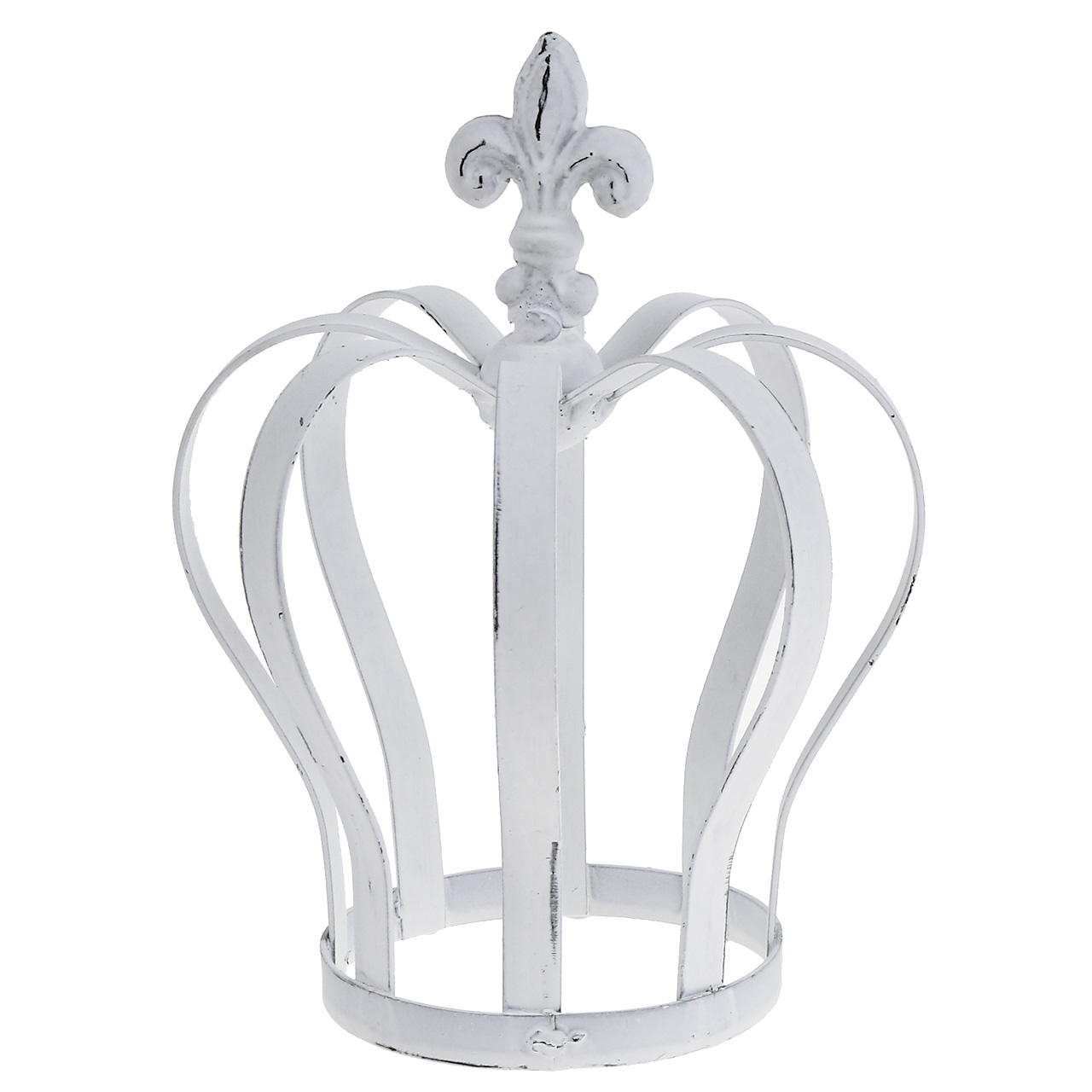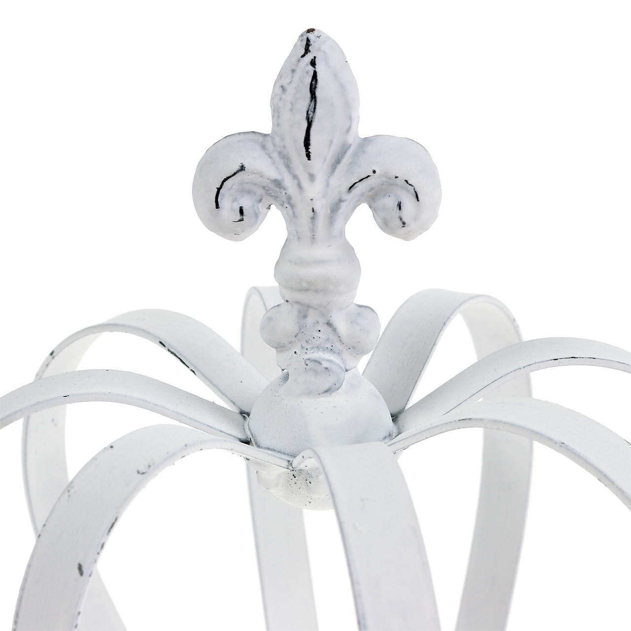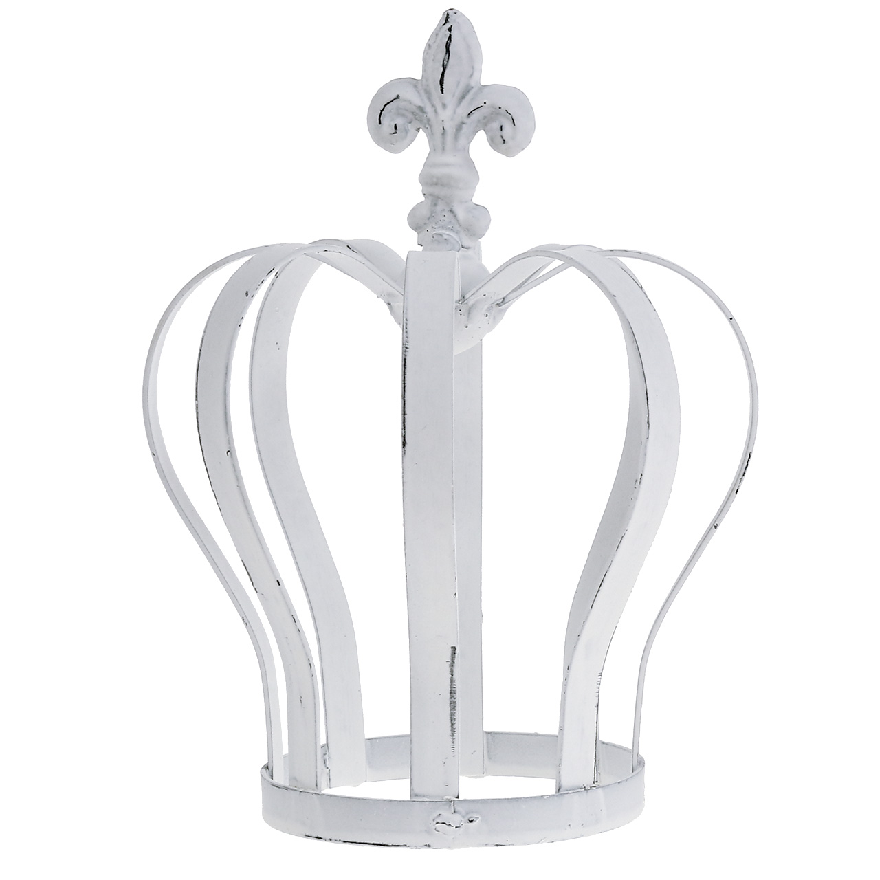 Ainutlaatuinen kruunu mihin tahansa sisustukseen ja myös ulkokoristeluun: antiikinvalkoinen metallikruunu! Kruunu on valmistettu tukevasta metallista, ja sen valkoinen mattapinta on vain osittain läpinäkymätön, mikä antaa sille vintage-ilmeen, joka sopii hyvin shabby chic -koristeeseen. Kaarevat metallijouset päättyvät yläosassa olevaan koristeeseen.