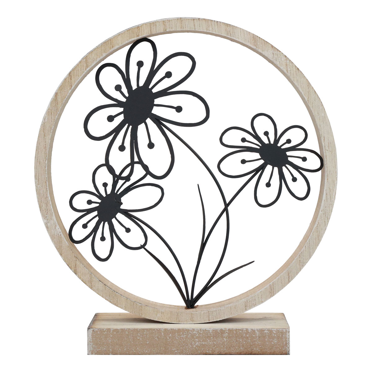Koristerenkaalla varustettu teline on luonnonvärinen, mutta kevyesti pesty valkoinen. Tämä tyylikäs pöytäkoristeen runko on valmistettu puusta, kun taas kolme ihanaa kuvakirjan kukkaa on valmistettu ohuesta, mustasta metallista. Tämä luo maalaismaisen ja samalla ilmavan kevätkoristeen.