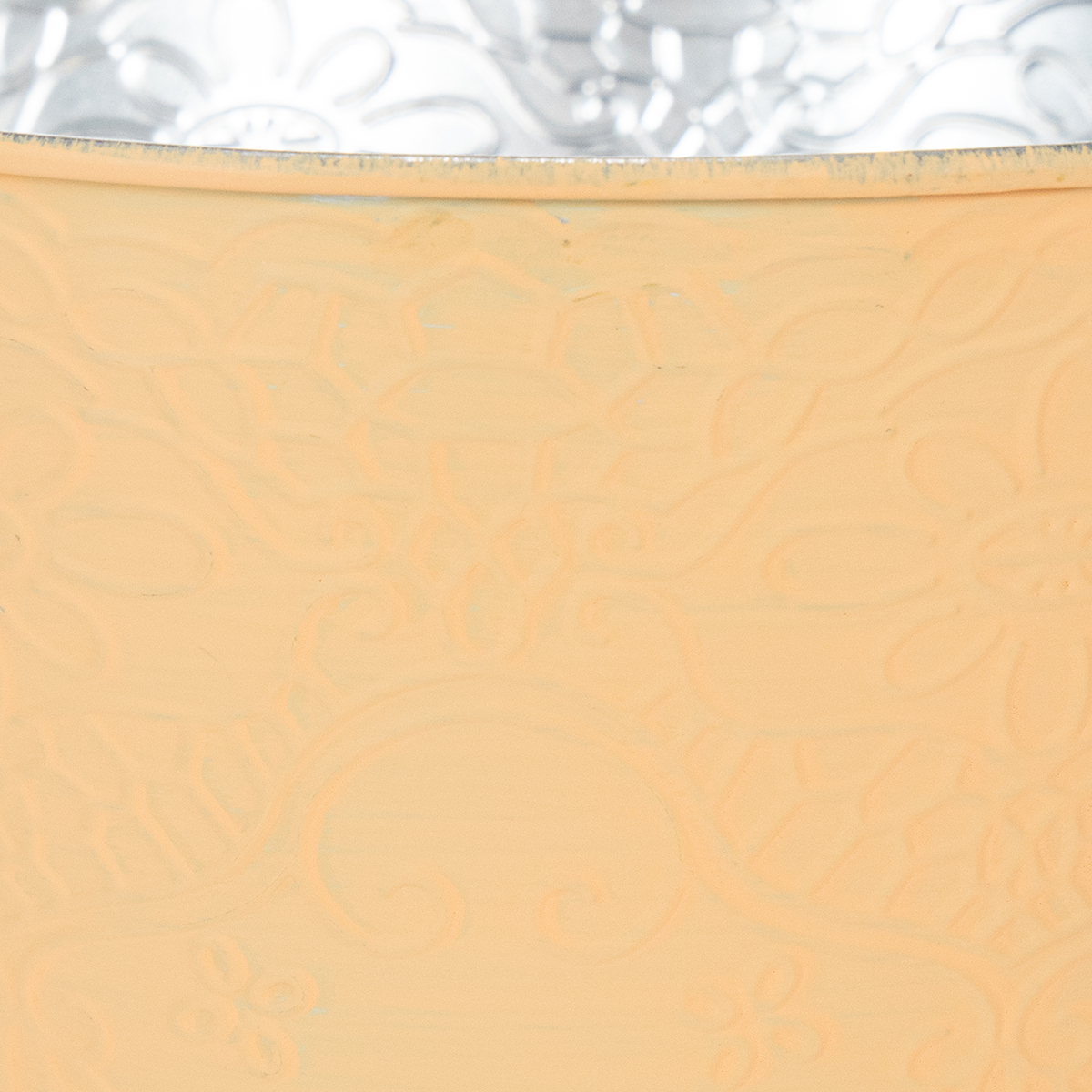 Kohokuvioidut kukat ja langat antavat kukkaruukuun upean vintage-ilmeen. Ulkopuoli miellyttää trendikkäällä oranssilla pastellivärillä, joka on levitetty näkyvillä siveltimen vedoilla.