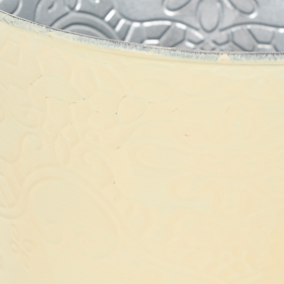 Laadukas metallikoristelu on koristeltu kohokuvioidulla kukkakuviolla täynnä retro-tyyliä ja maalattu ulkopuolelta kirkkaan keltaiseksi näkyvillä siveltimen vedoilla. Kukkaruukun kukat ja lonkerot tuovat mieleen