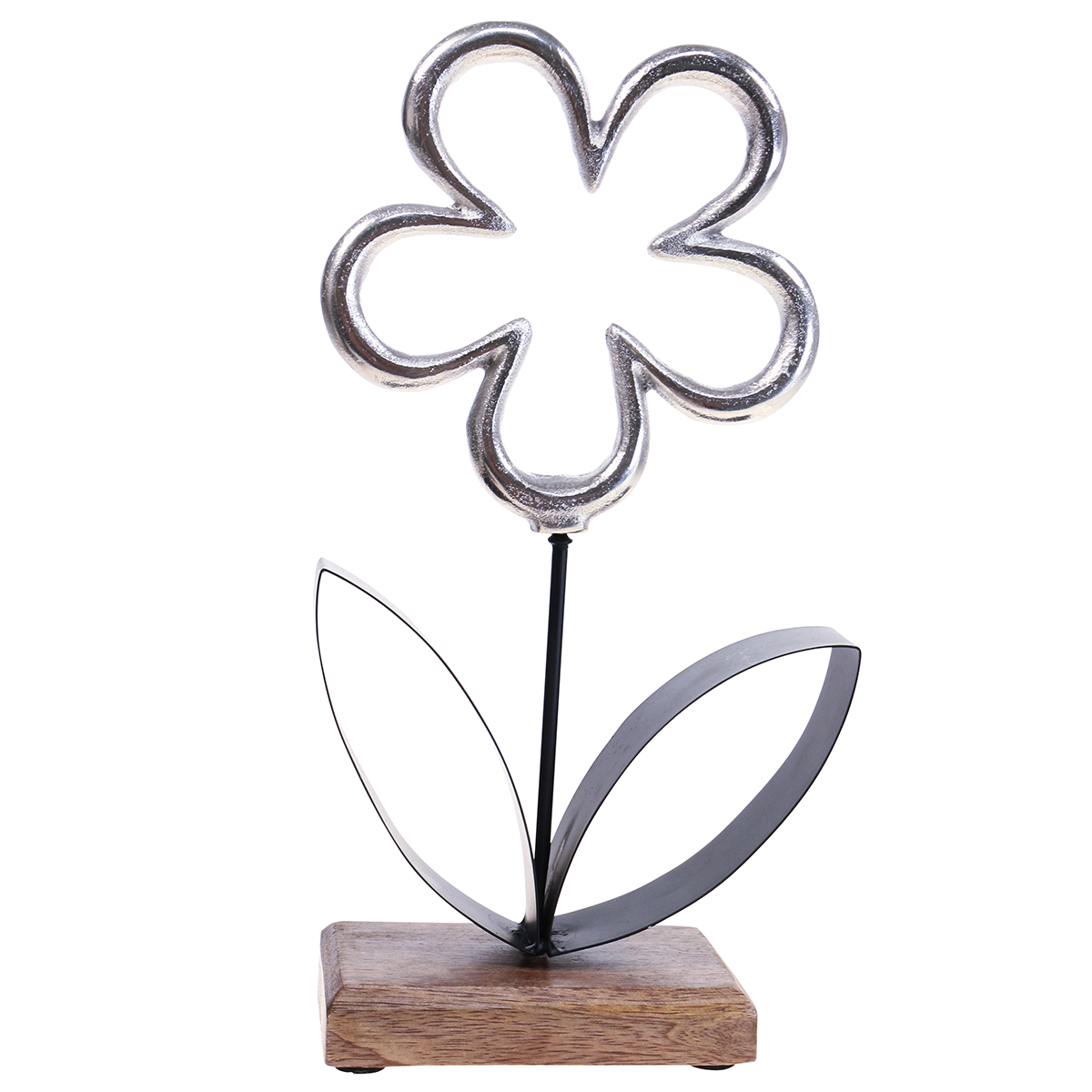 Koristekukan pohja on puuta, varsi ja iso kukka metallia. Kukan yksittäiset osat esitetään pelkkinä siluetteina. Pöydän koristelu on yhtä aikaa tyylikäs ja ystävällinen.