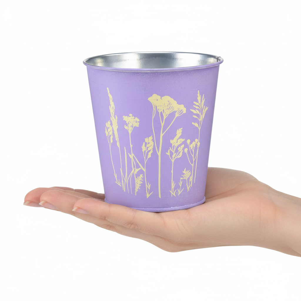 Metallinen kukkaruukku on kevään väriltään violetti ja kauniilla kukka-aiheella, joka muistuttaa niittyä. Haluat istuttaa istutuskoneeseen heti varhaisia kukkivia!