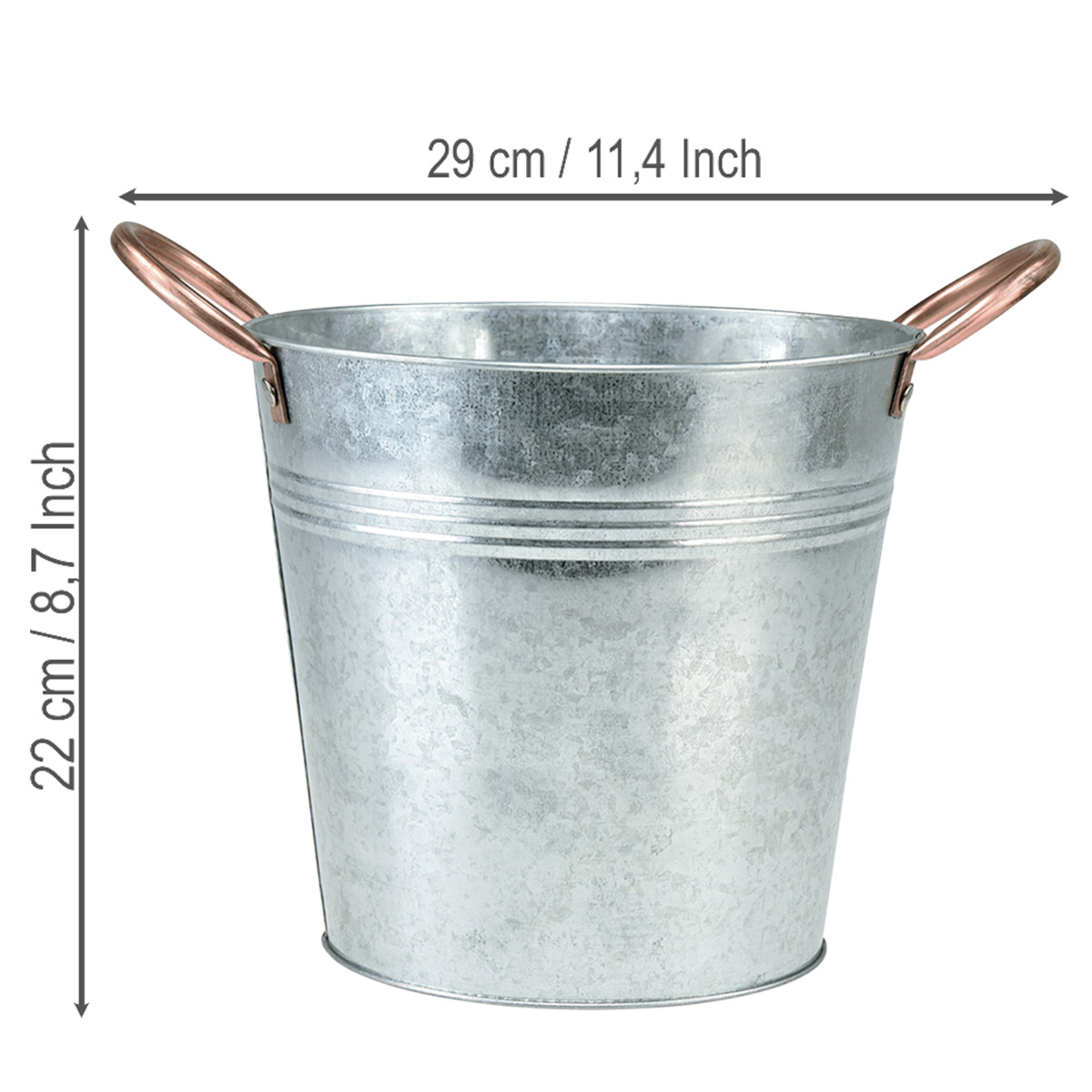 Tämän metallikauhan kuparinväriset kahvat luovat kiehtovan kontrastin eri metalleista. Galvanoitu, kiiltävä hopeapinta antaa istutuskoneelle hienovaraisen vintage-ilmeen. Ennen istutusta metallisäiliö on suositeltavaa vuorata foliolla ruosteen ja korroosion estämiseksi.