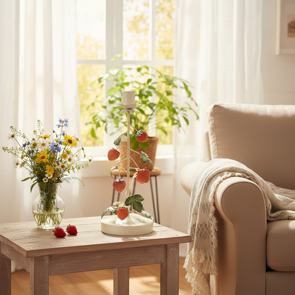 Ainutlaatuinen metallinen kynttilänjalka mansikkakoristeella – ihanteellinen kesäkoristeeseen