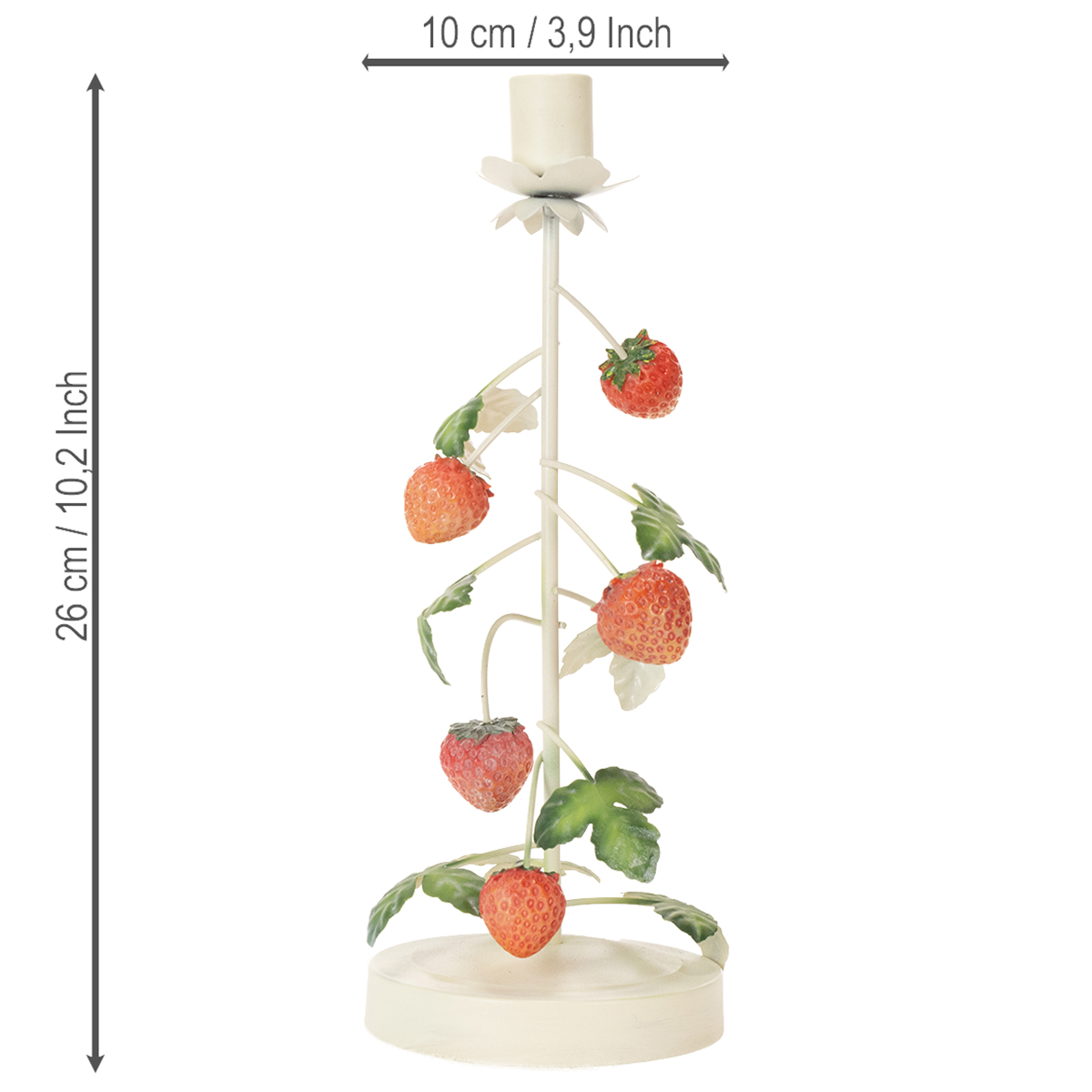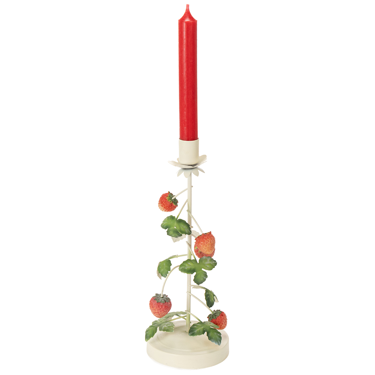 Metallinen kynttilänjalka mansikkakoristeella, kermanvärinen, pyöreä, korkeus 26 cm