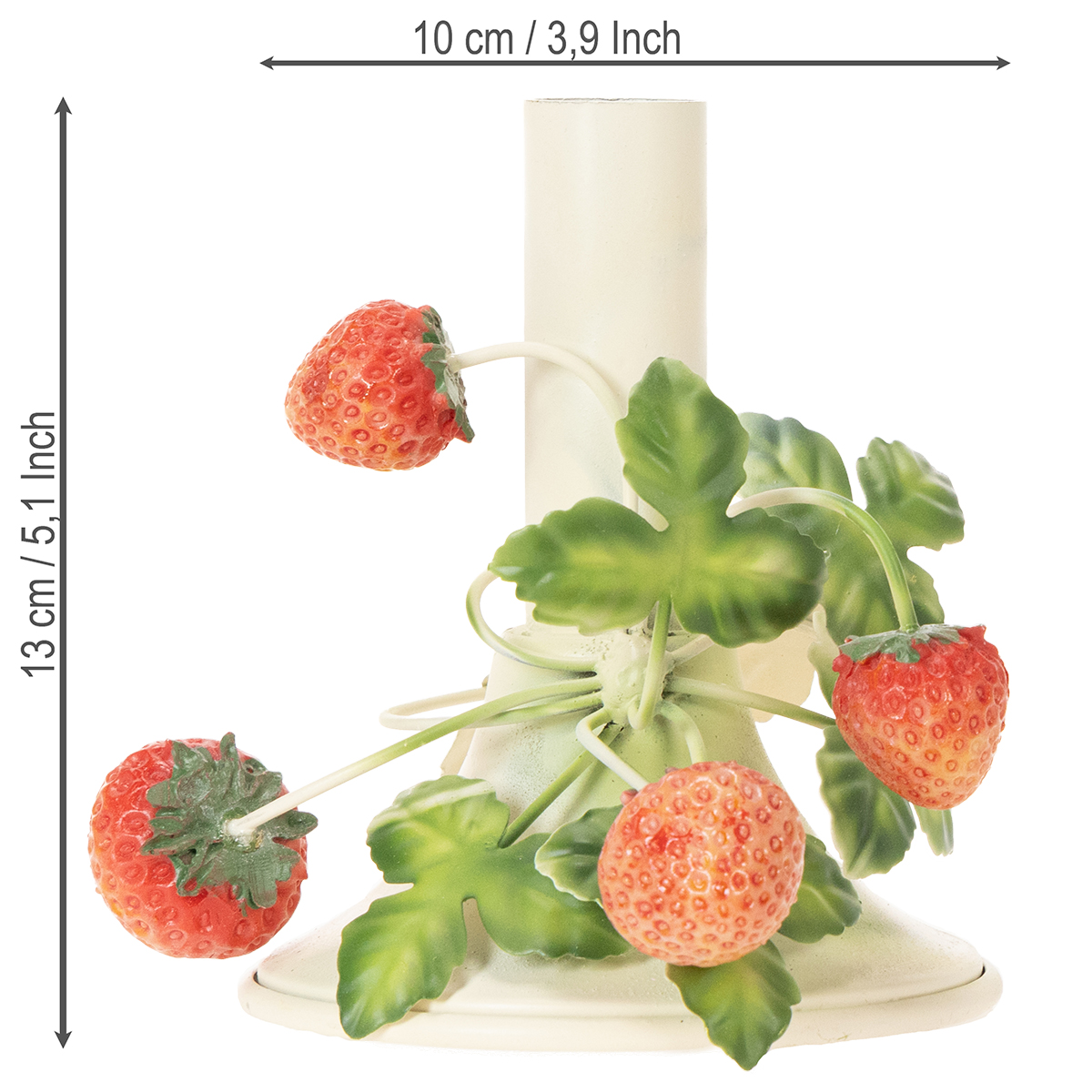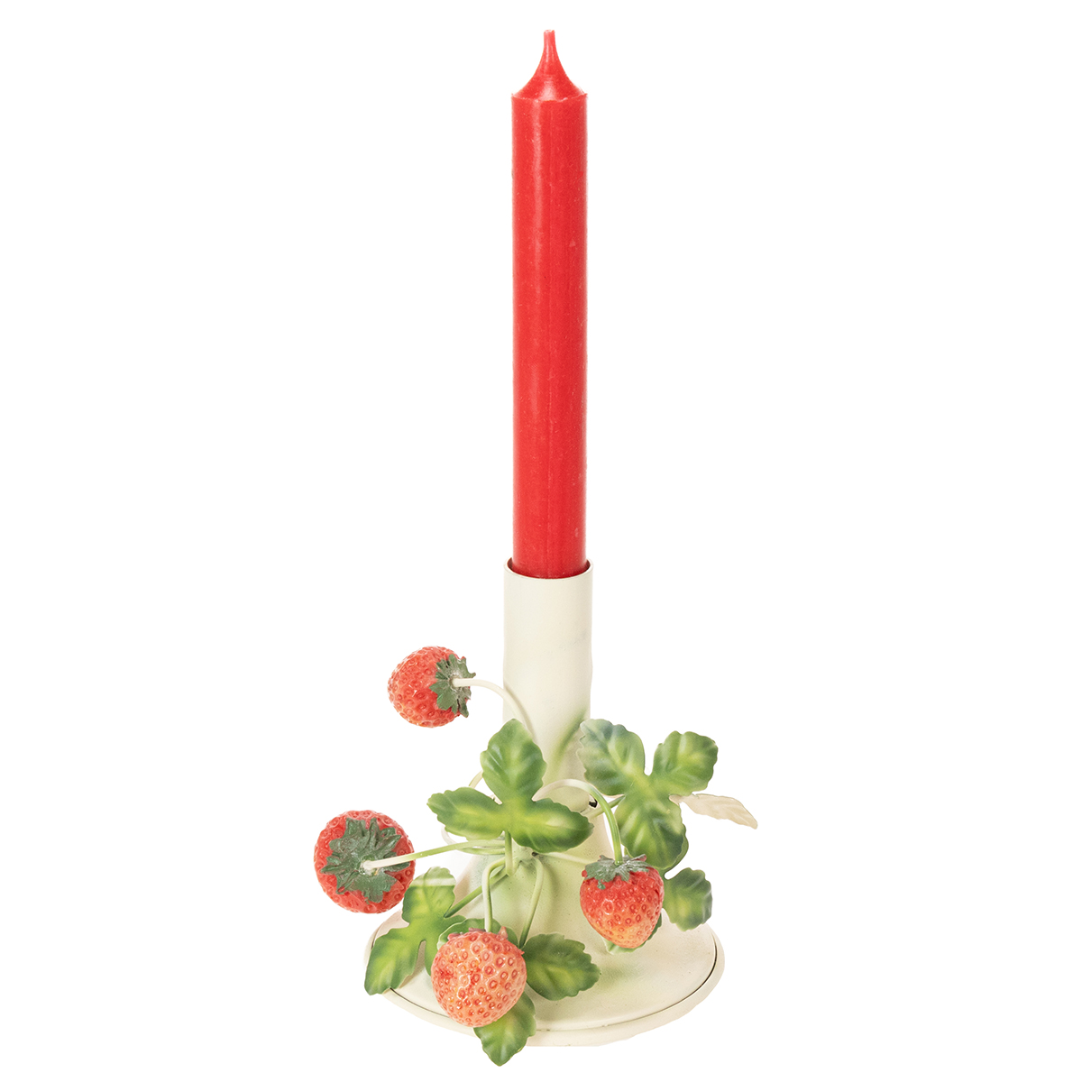 Metallinen kynttilänjalka mansikkakoristeella, kesäkerma, korkeus 13 cm