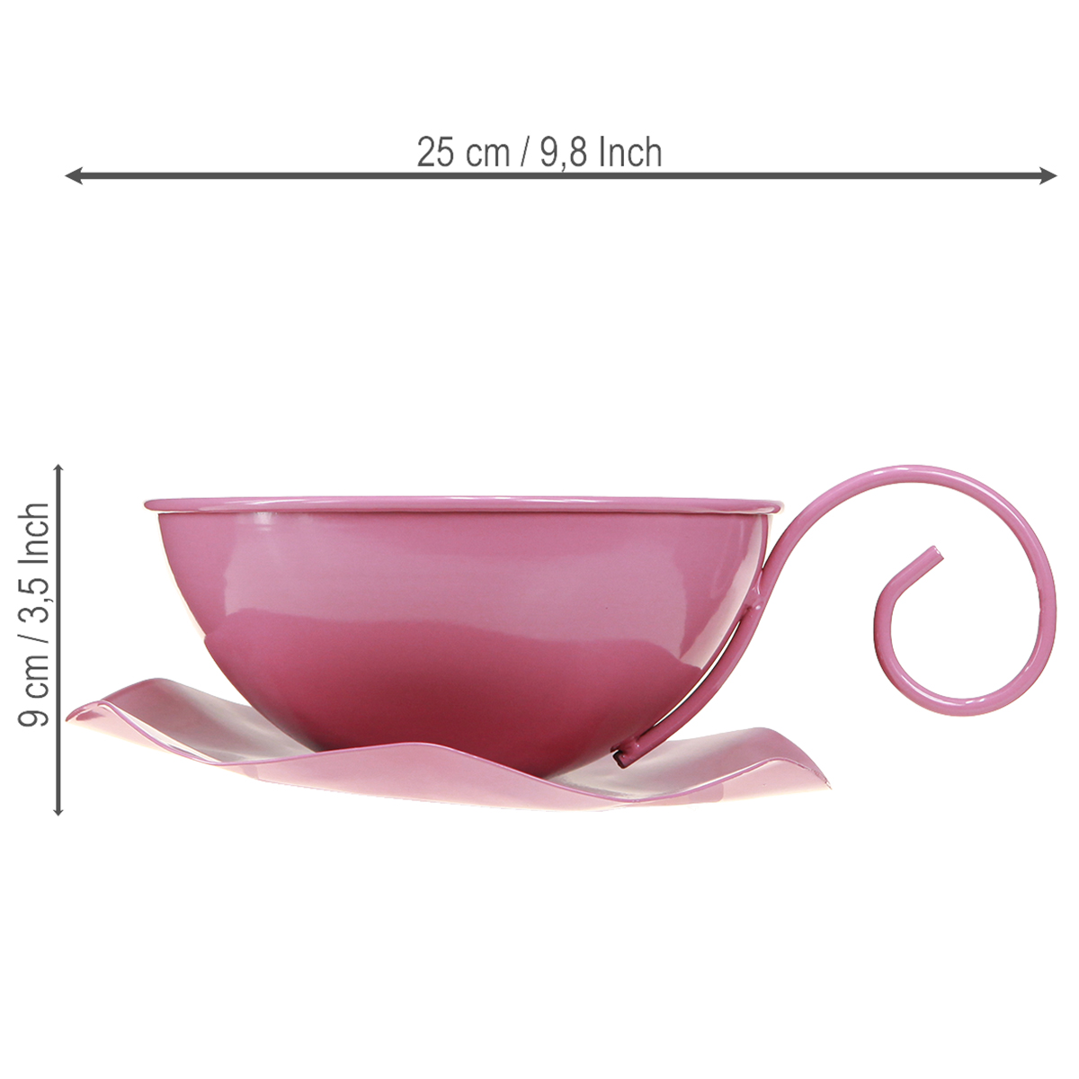 Vaaleanpunainen koristekuppimme on todellinen kohokohta jokaiseen kotiin. Halkaisijaltaan noin 16 cm ja korkeudellaan noin 9 cm, metallikuppi sopii sekä koristeellisiin että toiminnallisiin sovelluksiin. Pastellin vaaleanpunaiseksi maalattu pinta kiinnittää kaikkien huomion ja luo iloisen, kutsuvan tunnelman. Kaareva kahva ja kukkamainen lautanen antavat kupille leikkisän, mutta modernin ilmeen. Lautaseen kiinnitetyn kupin ansiosta tämä metallikoristelu sopii erinomaisesti esittelyyn juhlapöydälle tai ikkunalaudalle.