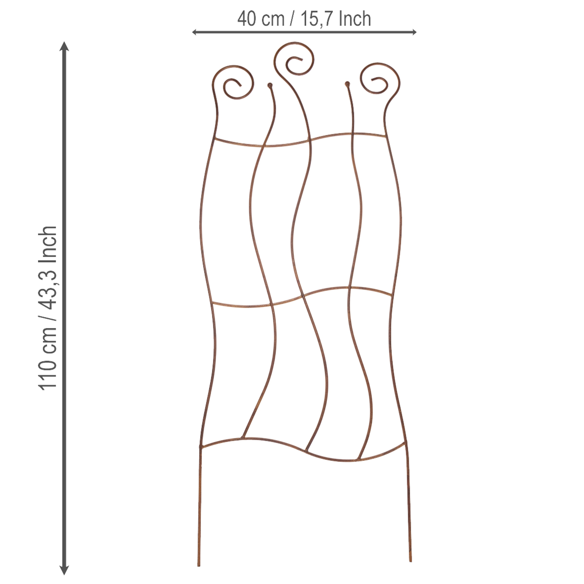 Tämä koristeellinen metallisäleikkö on upea lisä mihin tahansa puutarhaan. Sen sulavat linjat antavat sille eleganssia, joka sopii täydellisesti luonnollisiin, romanttisiin tai moderneihin puutarhatyyleihin. Kestävän rakenteensa ansiosta säleikkö ei ainoastaan tarjoa vakaata tukea, vaan toimii myös koriste-elementtinä – olipa kyseessä sitten puutarha-alueiden jakaja tai katseenvangitsija poluilla ja kukkapenkeissä. Sään kuluttama teräspatina luo hienostuneen ilmeen, joka sopii kauniisti mihin tahansa ympäristöön. Ja mikä parasta: säleikkö on uskomattoman helppo puhdistaa. Kostea liina riittää lian ja sään aiheuttamien jäämien poistamiseen.