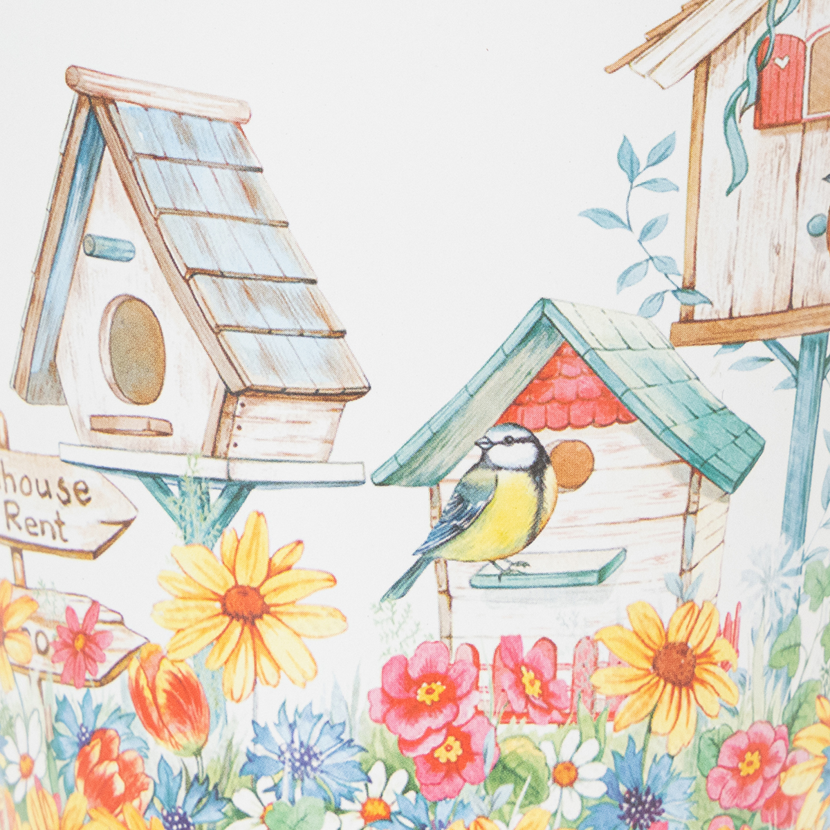 Tämä peltiämpäri on päällystetty painetulla kalvolla, jossa näkyy värikäs kukkameri kolmella eri pesimälaatikolla - myös muutama lintu näkyy.