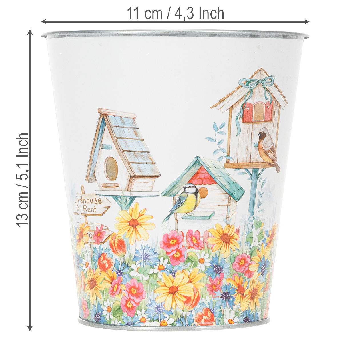 Metallinen ruukku aiheella, istutuslaatikko linnunpöntöillä, peltiämpäri K13cm Ø11.5cm