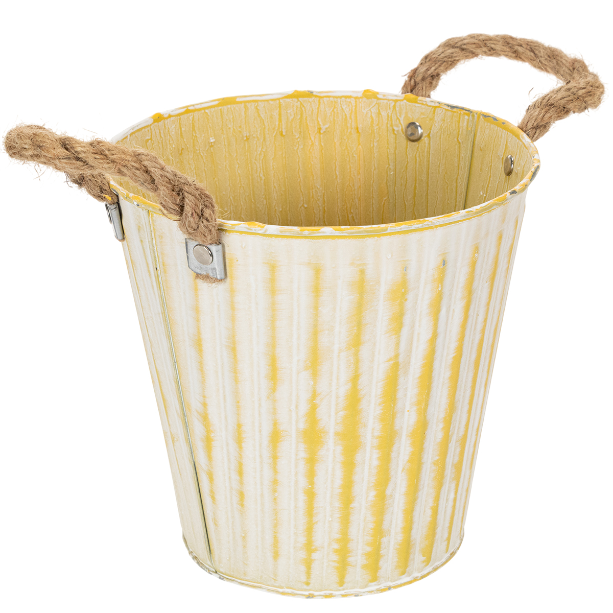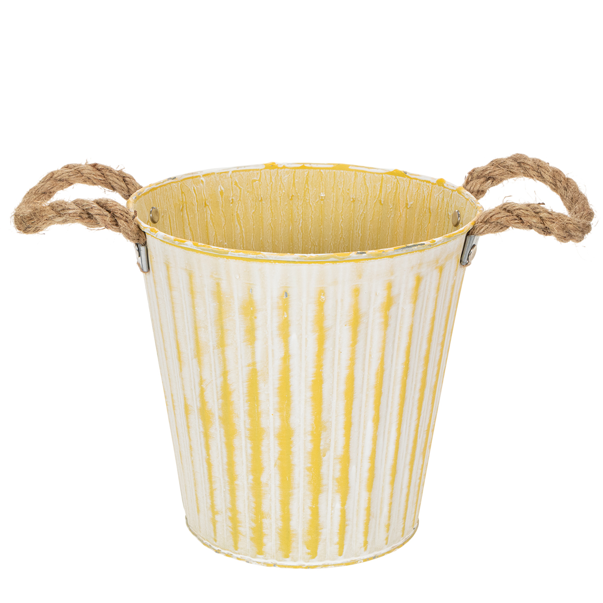 Tämä metallista valmistettu ruukku sopii täydellisesti kevätkoristeisiin: pastellin keltainen, juuttilangasta valmistettu istutuskone tulee valkoiseksi pestynä trendikkäässä nuhjuisessa chicissä.